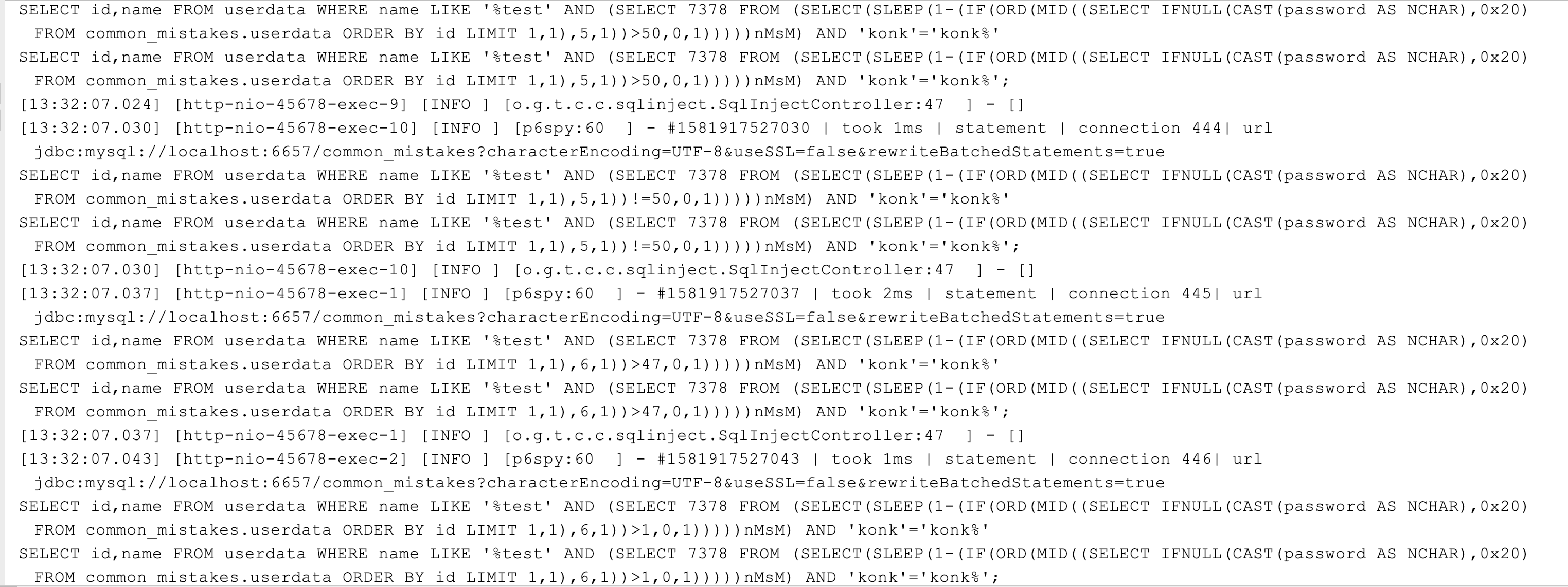 //用户模糊搜索接口 @PostMapping("jdbcwrong") public void jdbcwrong(@RequestParam("name") String name) { //采用拼接SQL的方式把姓名参数拼到LIKE子句中 log.info("{}", jdbcTemplate.queryForList("SELECT id,name FROM userdata WHERE name LIKE '%" + name + "%'")); }
