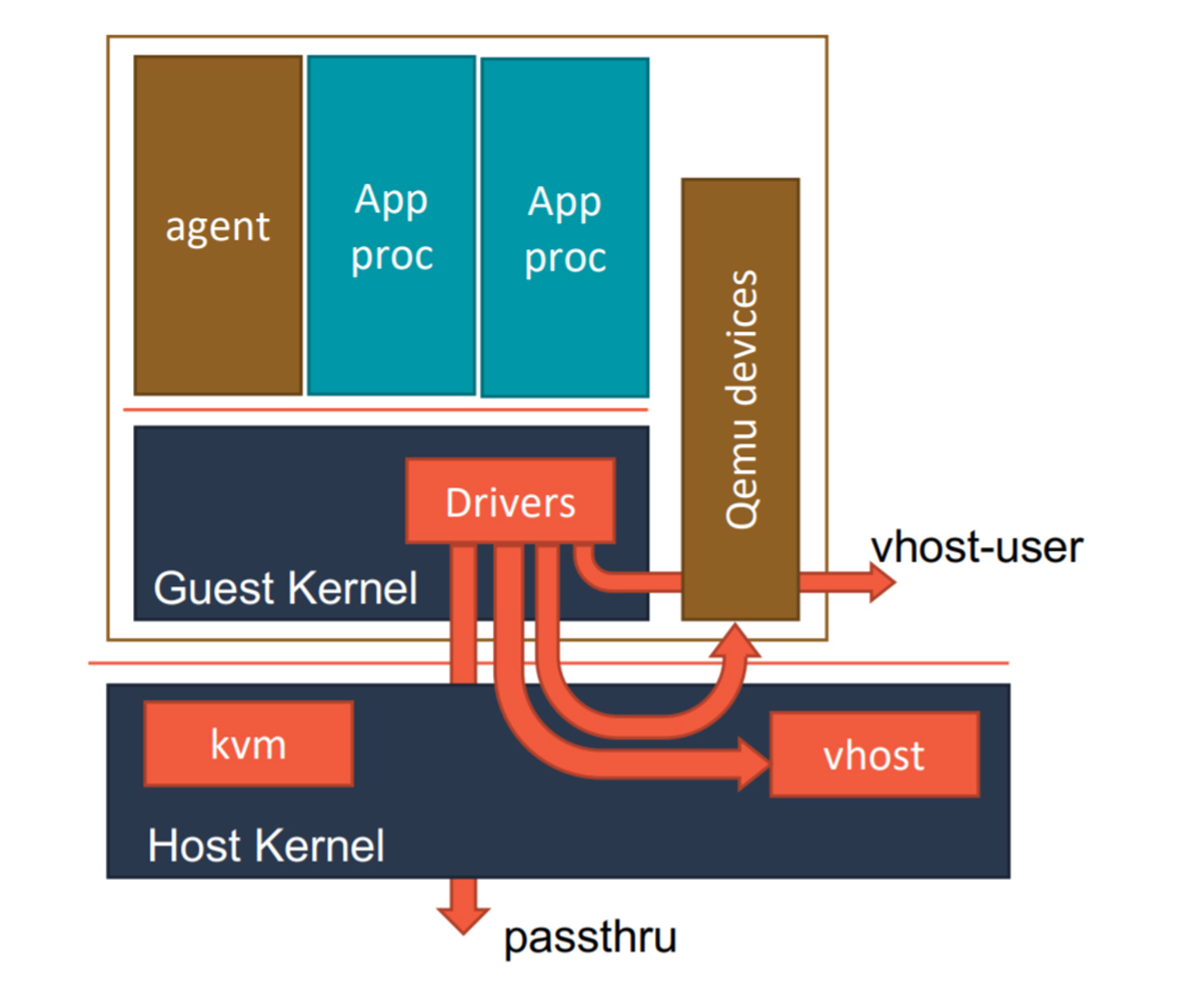 而为了能够对这个虚拟机的 I/O 性能进行优化,Kata Containers 也会通过 vhost 技术(比如:vhost-user)来实现 Guest 与 Host 之间的高效的网络通信,并且使用 PCI Passthrough (PCI 穿透)技术来让 Guest 里的进程直接访问到宿主机上的物理设备。这些架构设计与实现,其实跟常规虚拟机的优化手段是基本一致的。