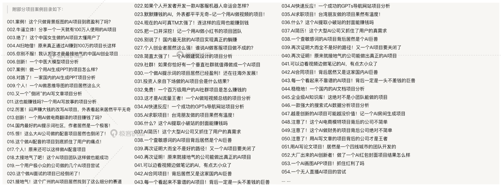 我先把跟踪的一百多个项目用列表的形式写出来了,而且,我给每个项目都做了一篇分析报告,并且把每个项目最核心的特点用标题总结出来了,你可以看一看。