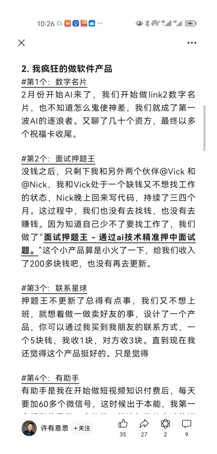 再来看另一个我跟踪了一年多的AI创新项目,我自己正好也是这个产品的用户,所以感受更直观一些。这个项目的核心功能点是帮用户写爆款小红书。这也是我去年看到的比较接近传统互联网创业做法的一个团队。