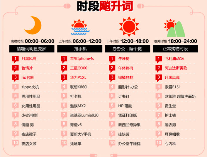 前面提到过,江南春通过阿里巴巴、京东等电商平台的数据,发现了中国人最核心的消费决策的发生地点。我再举个自己的例子,多年前,我在网易做电商时,看到京东发布的一份用户搜索报告,发现用户在不同时间段的心态及购物行为完全不同。