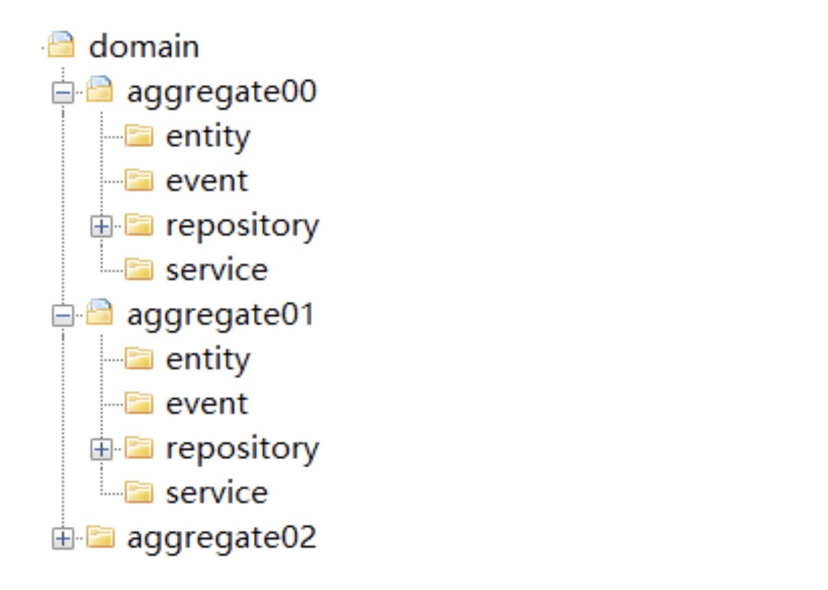 Domain 是由一个或多个聚合包构成,共同实现领域模型的核心业务逻辑。聚合内的代码模型是标准和统一的,包括:entity、event、repository 和 service 四个子目录。