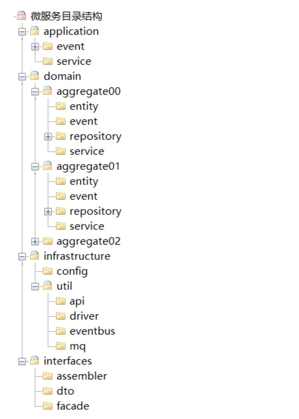 在完成一级和二级代码模型设计后,你就可以看到下图这样的微服务代码模型的总目录结构了。