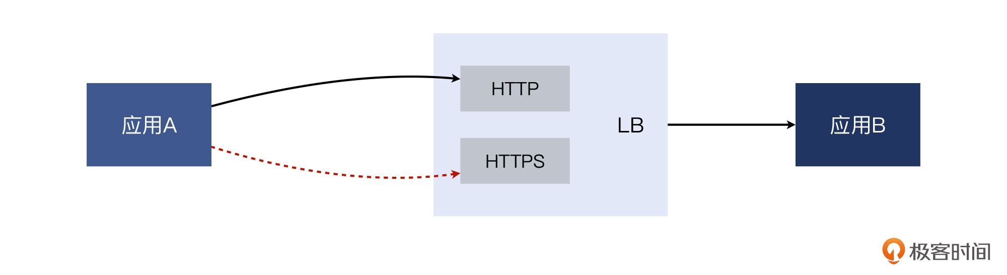 应用A和应用B各自都是一组独立的集群(多台服务器)。A的众多机器,都访问B的位于负载均衡(LB)上的VIP(虚拟IP),然后LB再把请求转发给B的机器。这里的HTTP和HTTPS都位于同一个虚拟IP,只是服务端口不同而已(一个是80,一个是443)。