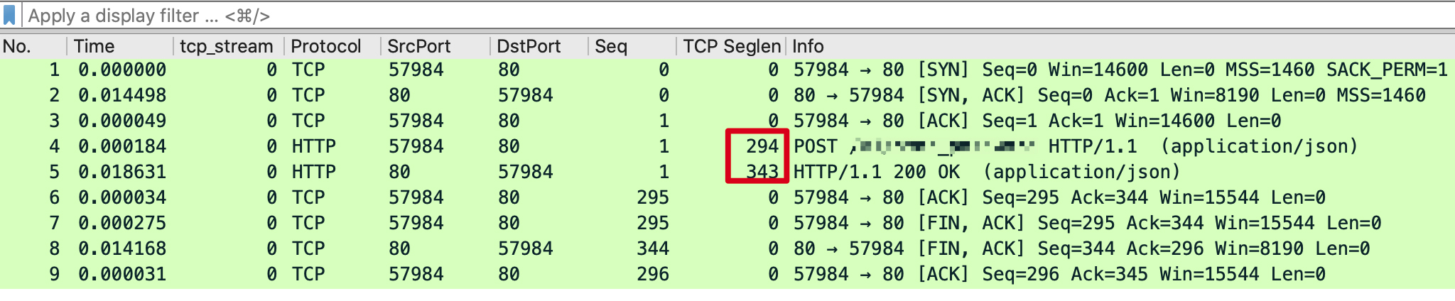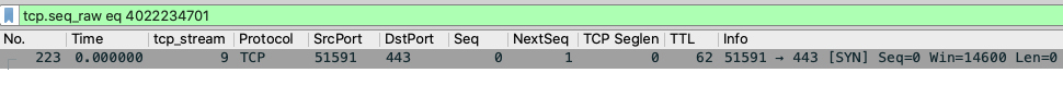 但是显然,这样处理后,无论在哪个TCP流里面,Wireshark展示的握手阶段序列号都是0,后续序列号也都是0+载荷字节数。相对序列号肯定是到处“撞车”的,所以不能作为选取的条件。