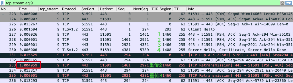 下面,我们再从服务端的角度,来看一下报文顺序、重传、1秒耗时这三者间的关系: