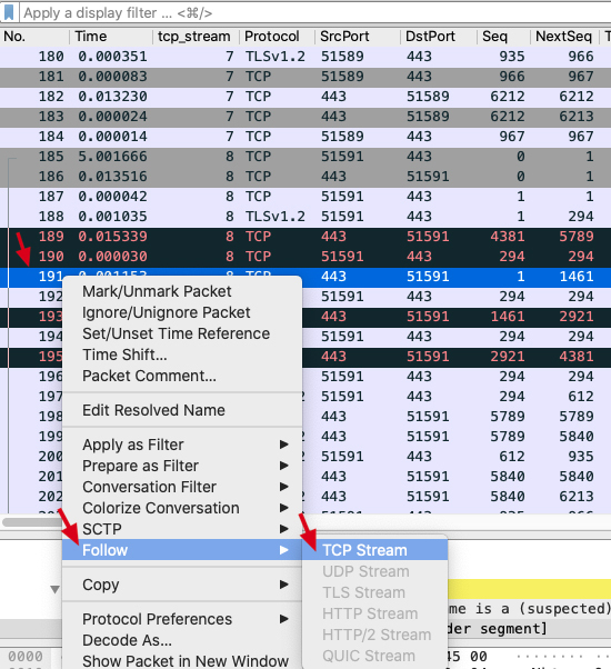 我习惯上会选择靠后一点的报文(因为相对靠后的报文所属的TCP流相对更完整),然后跟踪这些报文(Follow -> TCP Stream),找到所属的TCP流来进一步分析。比如选中191号报文,这时主窗口自动定位到了这条报文,我们在主窗口中选中该报文后右单击,选择Follow,在次级菜单中点击TCP Stream: