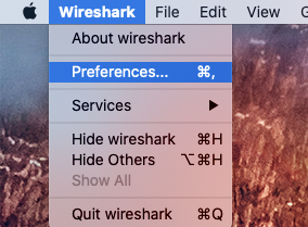 - 打开Wireshark的Preference(配置)菜单: