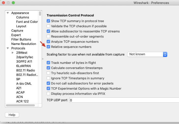 - 在弹出菜单的左侧选择Protocols,选中其中的TCP,然后在右侧的选项中,把“Relative sequence numbers”前面的勾去掉,就可以显示裸序列号了: