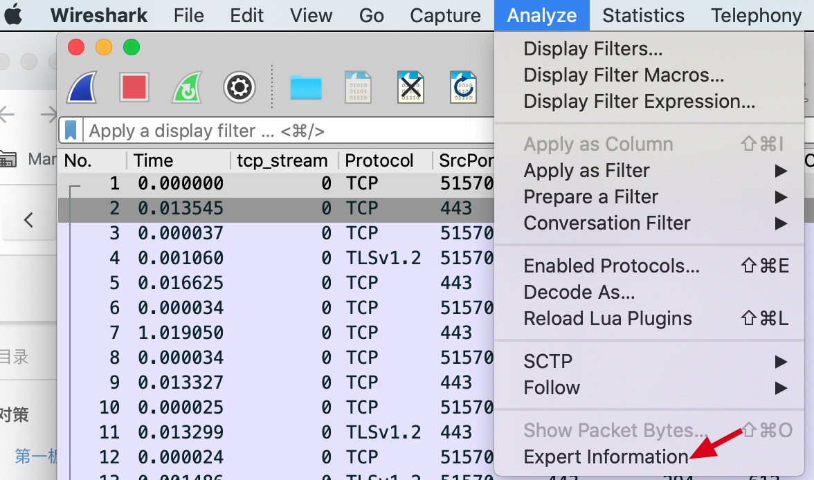 那么在查看的时候,一种方式是打开Analyze菜单,选择最底部的Expert Information,如下图所示: