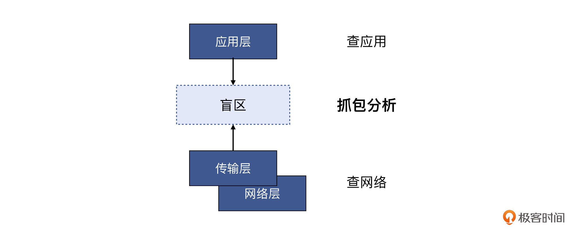 那么换位思考,你如果是开发团队,你会查哪些层面呢?对,一般是集中在应用程序上,可能也会做一点ping、telnet、traceroute之类的检查。但术业有专攻,难以把排查工作下探到传输层和网络层。