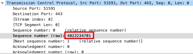 首先,我们可以记录下客户端侧抓包文件中,那条TCP流的某个报文的TCP序列号。比如选择SYN包的序列号,是4022234701: