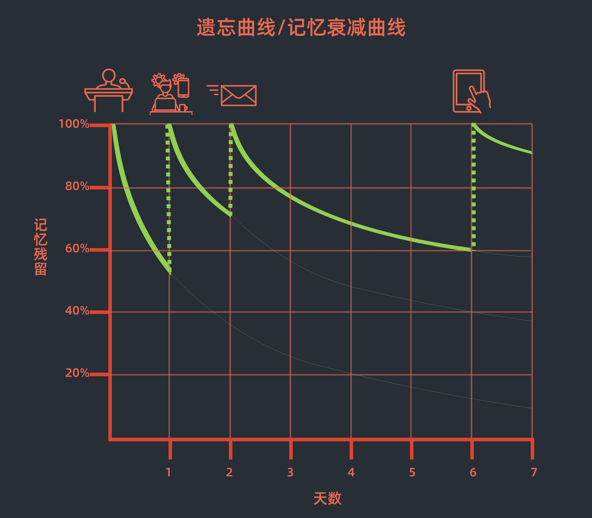 你可以再回想一下刚刚我提到过记忆的衰减曲线。为了避免记忆快速地呈指数级衰减,比较好的方法是定期强化训练。每次强化训练后,这个衰减速度就降低一些,反复强化,衰减率就非常低了。