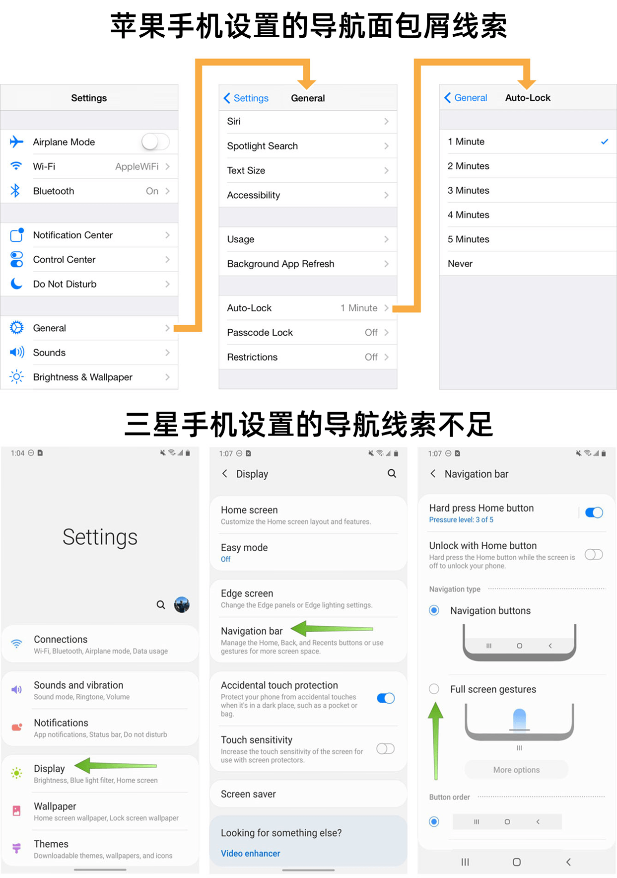 我给出了苹果手机的设置和三星手机的设置对比,你可以参考一下下图。苹果手机在每进入一个层级之后,都会看到上一级的名字,并用蓝色标识出来。而三星的设置则是每点入下一个层级,都没有这种导航线索。所以用户在复杂的导航跳转过程中,很快就会迷失掉。