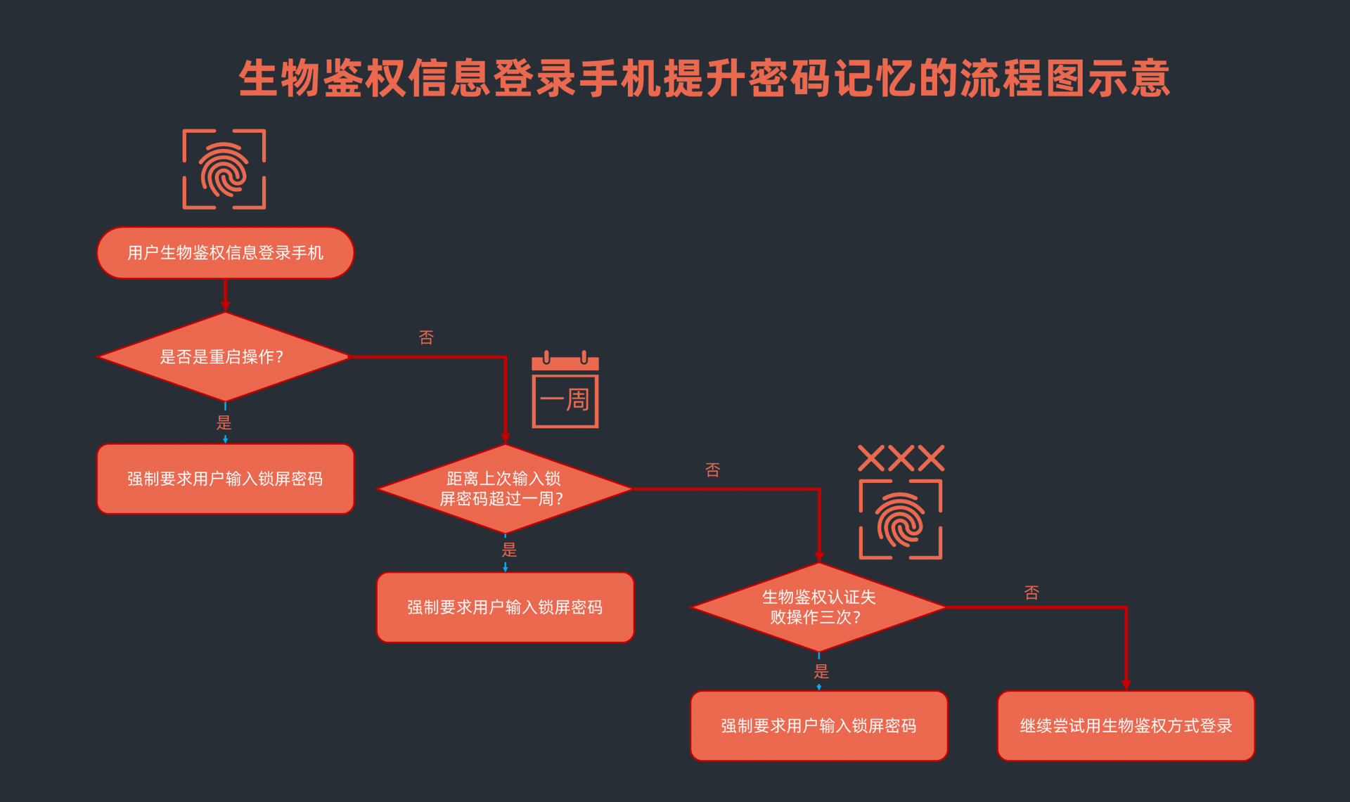 在一定周期内,一定要强制用户输入锁屏密码。下面我给出了你一个生物鉴权信息登录手机的流程图,你可以参考一下。