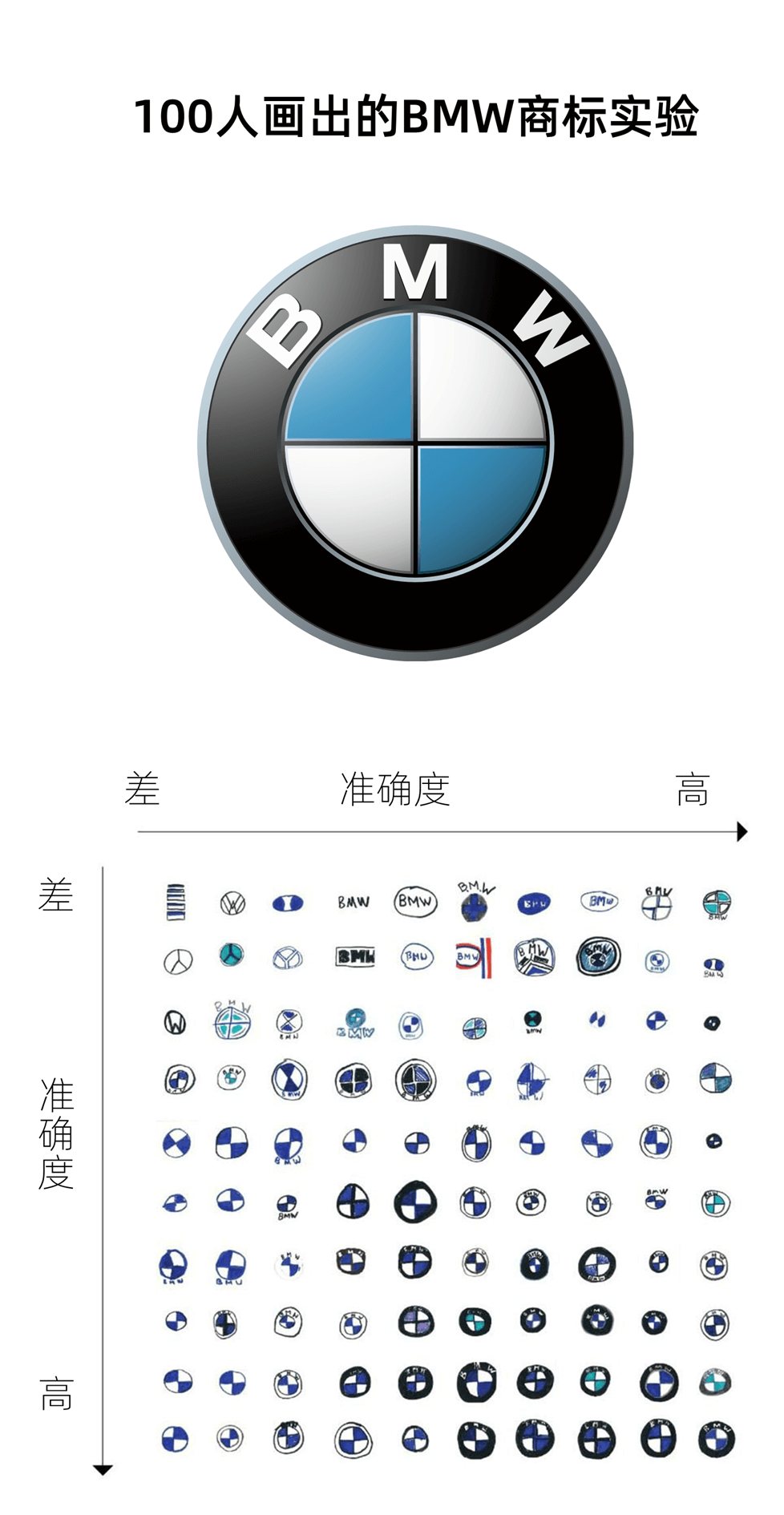 长期记忆可以从几小时、几天,到几年甚至一辈子。人的长期记忆同样是非常不靠谱的。有多不靠谱呢?英国一汽车经销商做过实验,找来100名不同年龄段的人,让他们画宝马车的logo。结果大家给出的答案五花八门,甚至很多人在基本形状上和颜色上都搞错了。