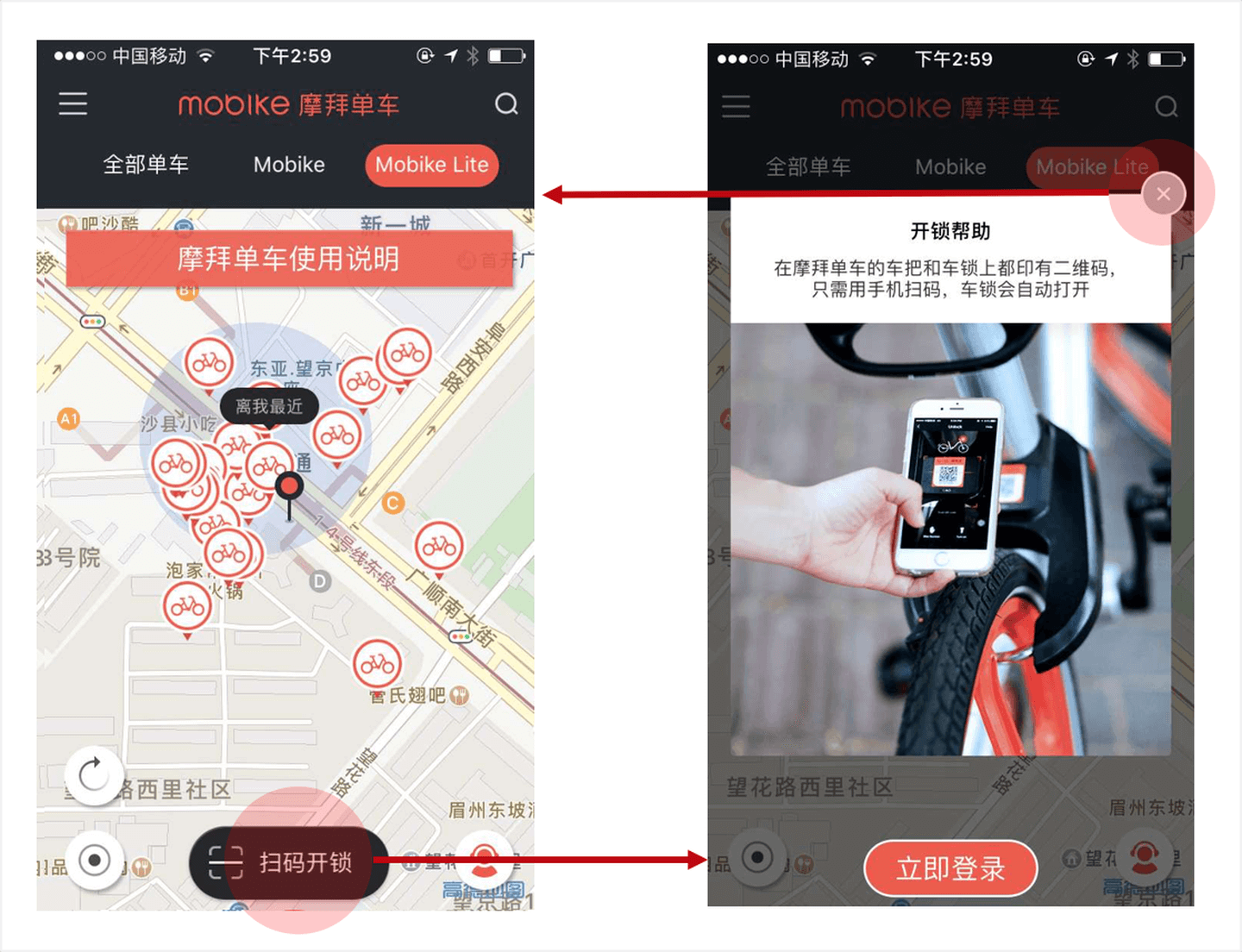 在上面这个页面中,当你点击扫码开锁时,会被弹出的开锁帮助提示干扰,你就很容易忽略掉了下方的立即登录按钮,这就是个失败的注意力吸引案例。