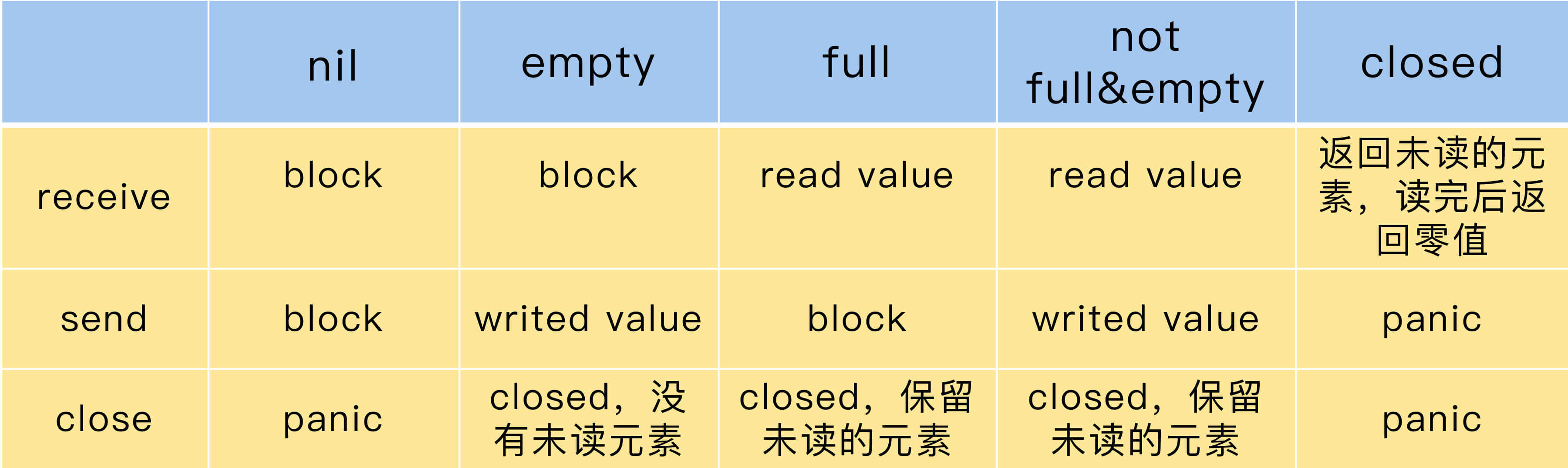 chan的值和状态有多种情况,而不同的操作(send、recv、close)又可能得到不同的结果,这是使用chan类型时经常让人困惑的地方。