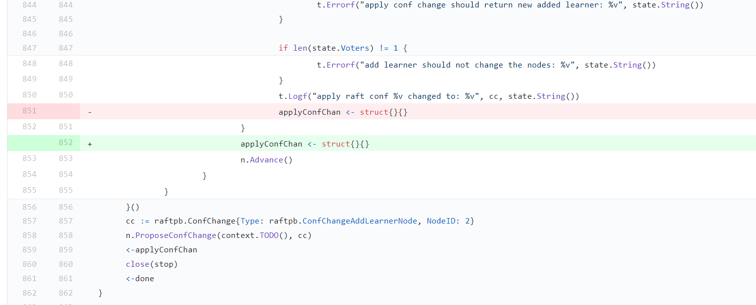 这段代码在for循环中就往此chan中写入了一个元素,结果导致TestNodeProposeAddLearnerNode从这个chan中读取到元素就返回了。悲剧的是,子goroutine的for循环还在执行,阻塞在下图中红色的第851行,并且一直hang在那里。