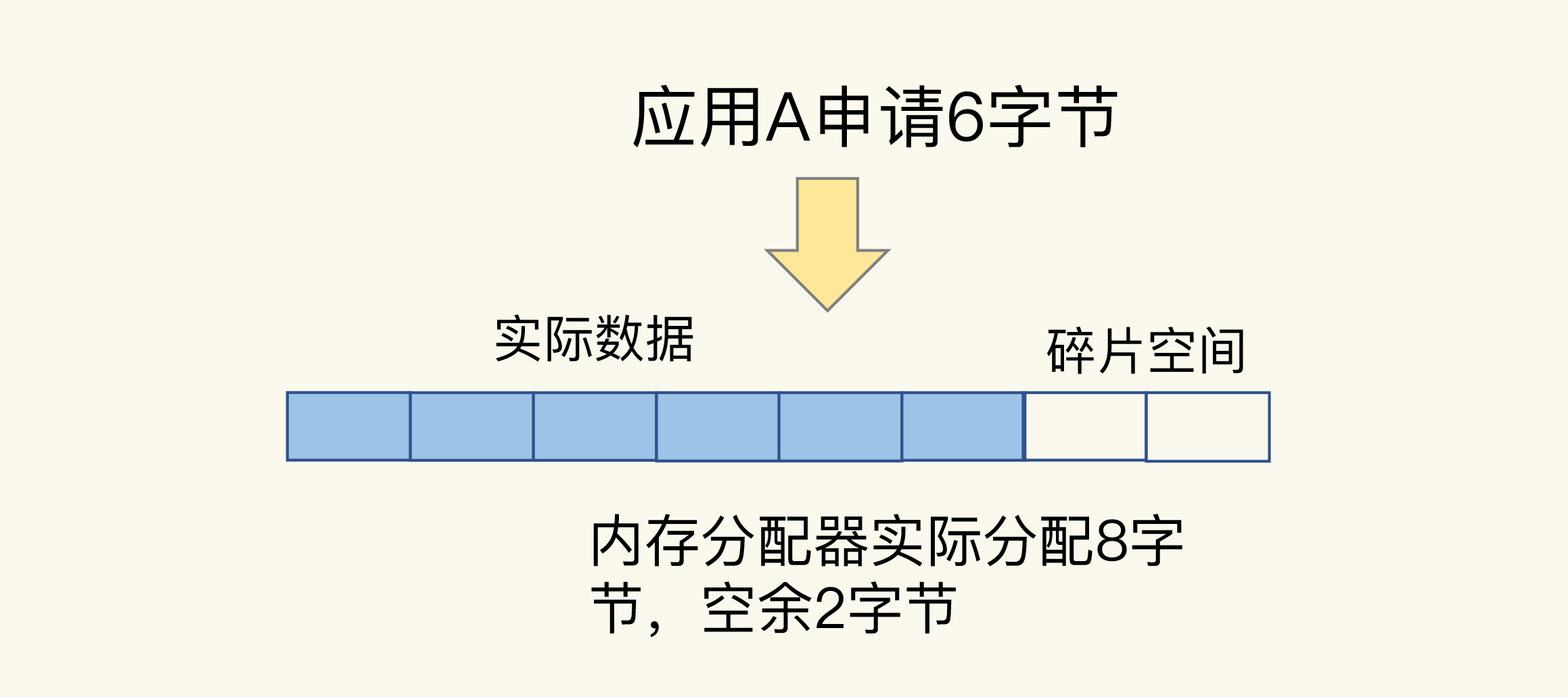 比如说,应用A保存6字节数据,jemalloc按分配策略分配8字节。如果应用A不再保存新数据,那么,这里多出来的2字节空间就是内存碎片了,如下图所示: