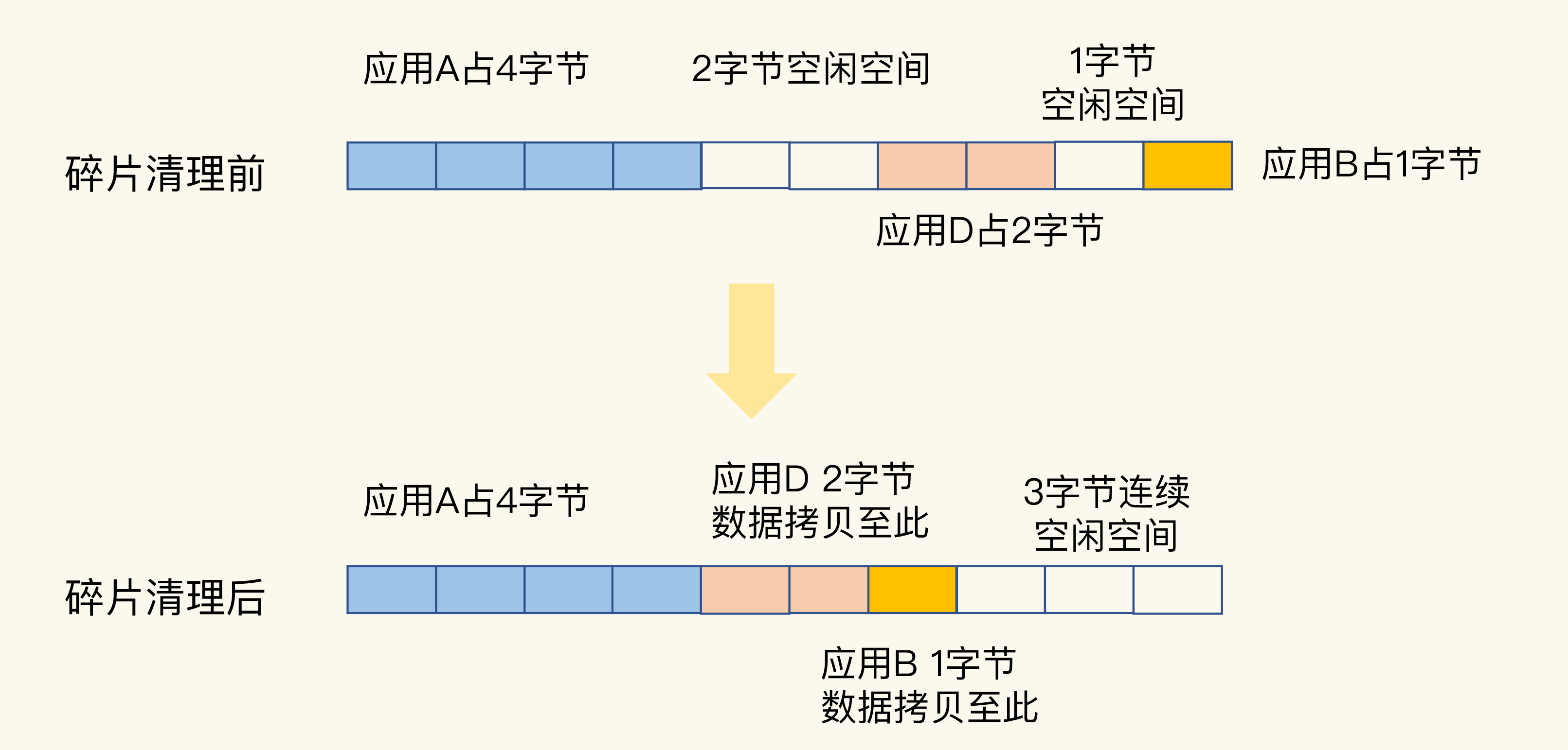 在进行碎片清理前,这段10字节的空间中分别有1个2字节和1个1字节的空闲空间,只是这两个空间并不连续。操作系统在清理碎片时,会先把应用D的数据拷贝到2字节的空闲空间中,并释放D原先所占的空间。然后,再把B的数据拷贝到D原来的空间中。这样一来,这段10字节空间的最后三个字节就是一块连续空间了。到这里,碎片清理结束。
