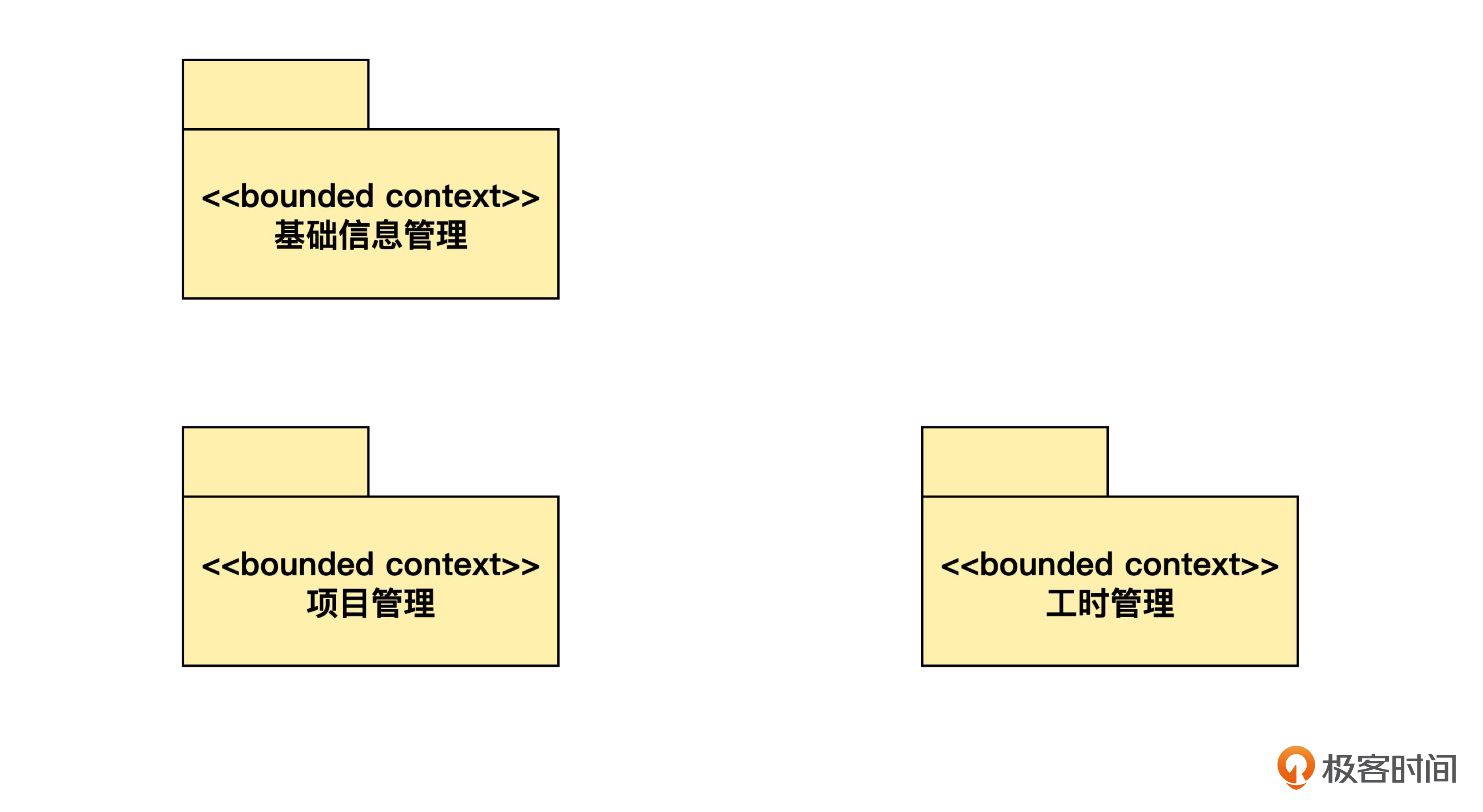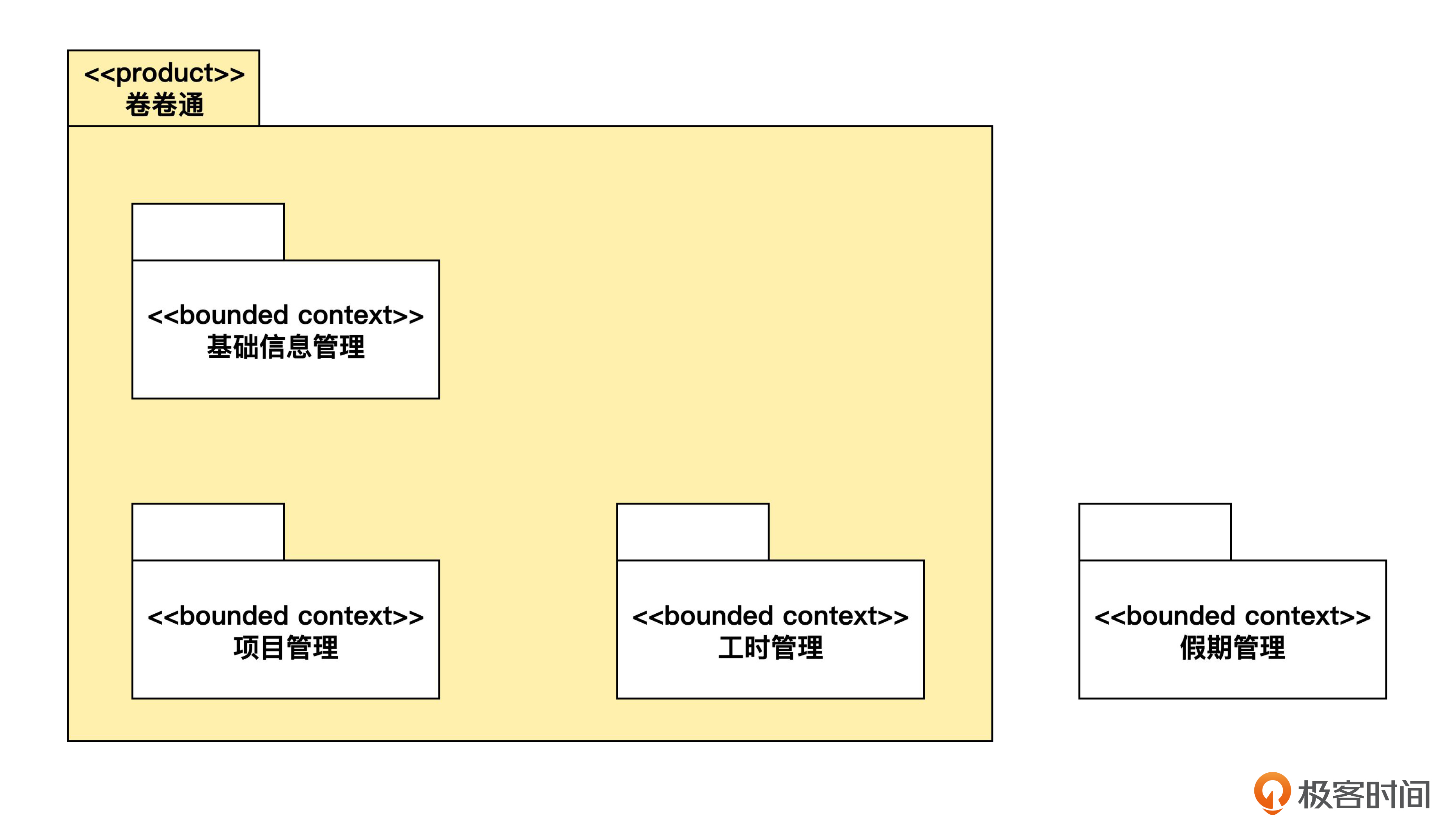 这里,你用带有 <> 衍型的包划定了我们产品的范围,并增加了假期管理这个外部的限界上下文。相应地,根据康威定律,我们可以把原来的开发团队分成 3 个小组。基础信息管理组 6 个人,项目管理组 5 个人,工时管理组 4 个人。