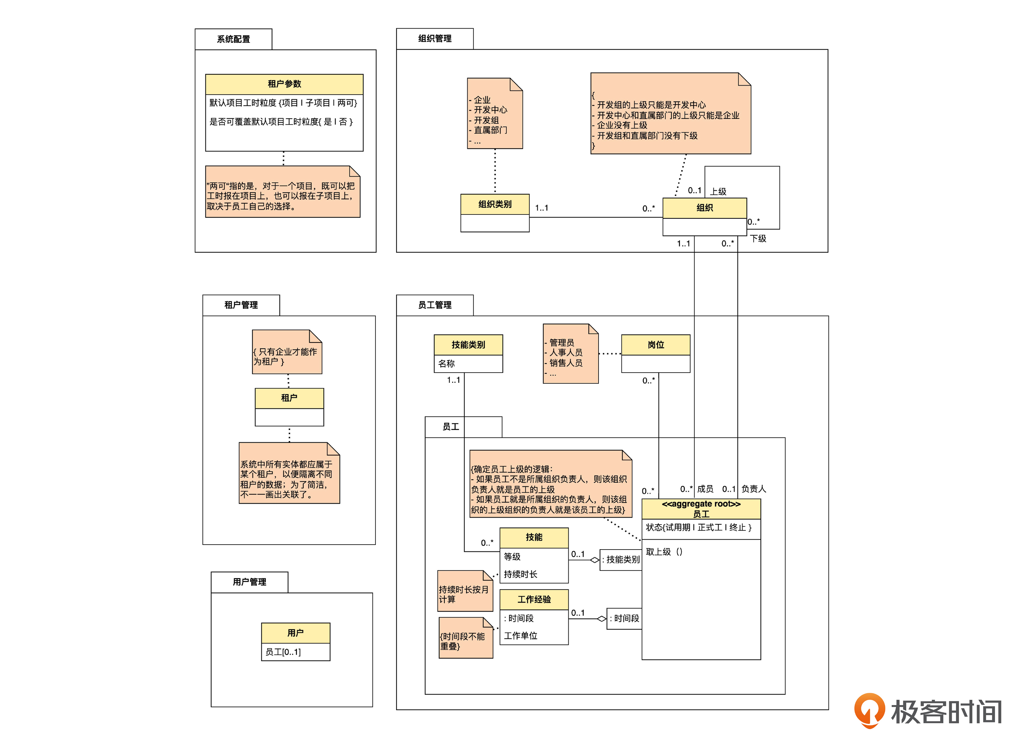 比如说,在基础信息管理上下文中,员工是一个带有技能和工作经验的聚合,同时,员工实体可能还有更多属性。而在项目管理上下文里,则不关注员工的技能和工作经验,员工里只有工号、姓名和状态三个属性就足够了。所以,尽管两个上下文里都有员工,但他们的关联和属性不同,所以这两种员工在概念上已经不一致了。