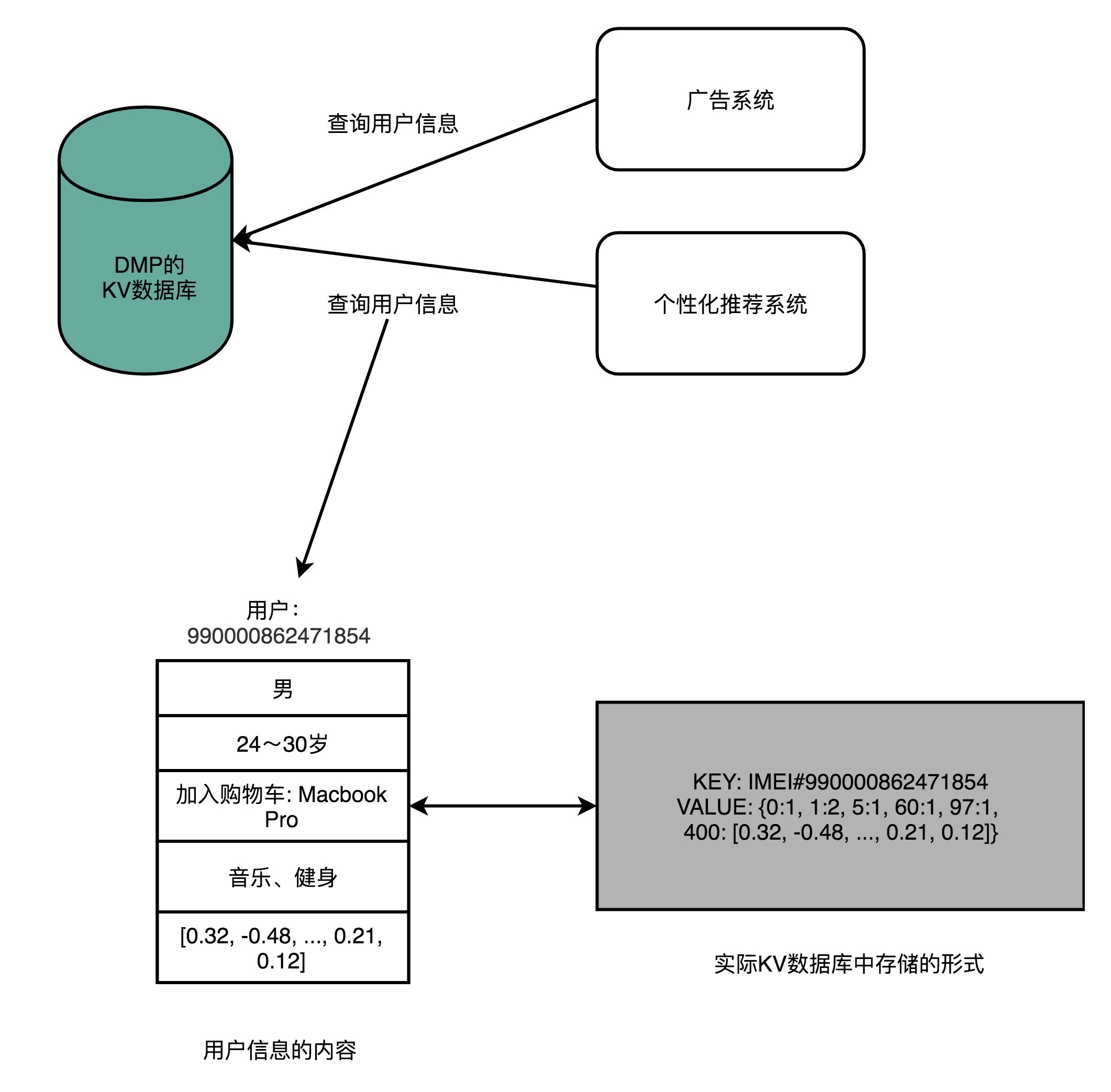 那么,一个DMP系统应该怎么搭建呢?对于外部使用DMP的系统或者用户来说,可以简单地把DMP看成是一个键-值对(Key-Value)数据库。我们的广告系统或者推荐系统,可以通过一个客户端输入用户的唯一标识(ID),然后拿到这个用户的各种信息。
