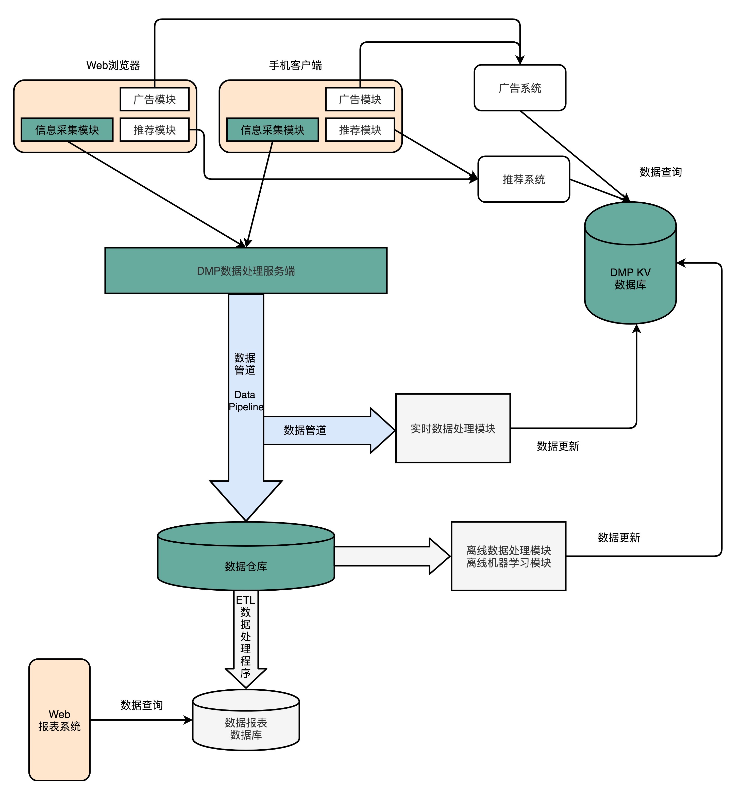 除了这个数据仓库之外,我们还会有一个实时数据处理模块(Realtime Data Processing),也放在数据管道的下游。它同样会读取数据管道里面的数据,去进行各种实时计算,然后把需要的结果写入到DMP的KV数据库里面去。
