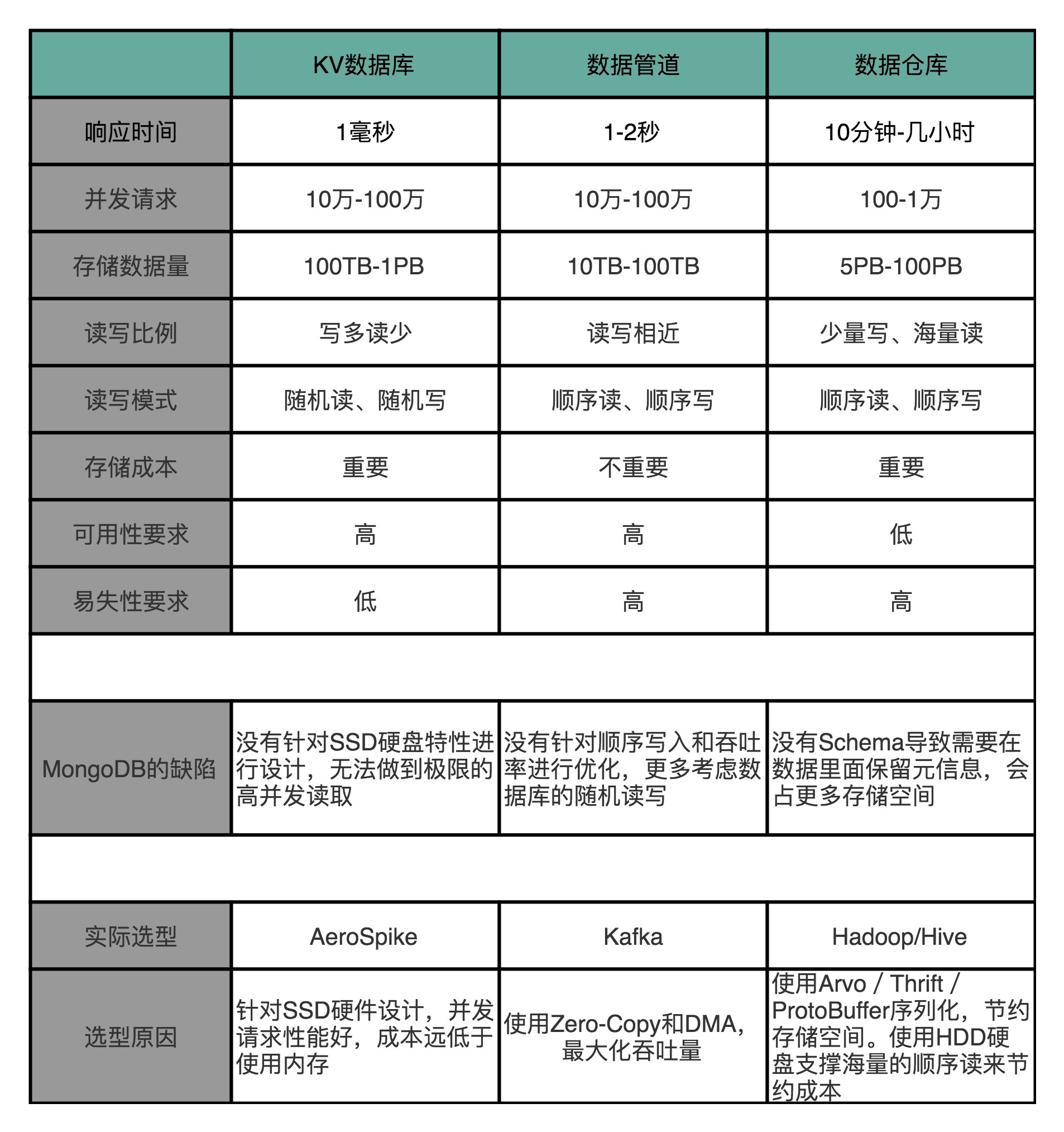我把KV数据库、数据管道和数据仓库的应用场景,总结成了一个表格,放在这里。你可以对照着看一下,想想为什么MongoDB在这三个应用场景都不合适。