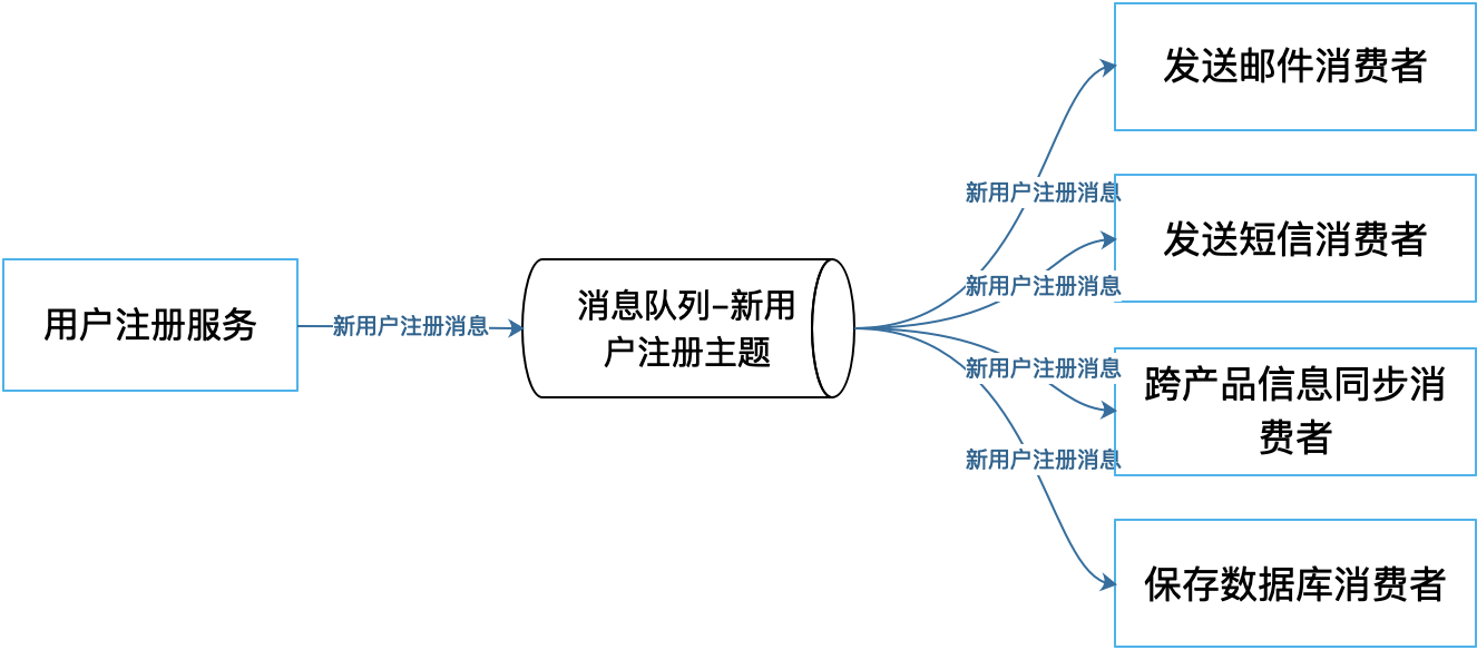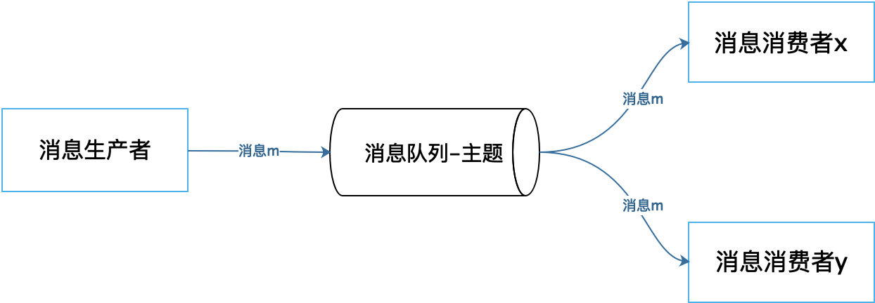 消息生产者向消息队列某个主题发布消息m,多个消息消费者订阅该主题,就会分别收到这个消息m。典型场景就是新用户注册,新用户注册的时候一方面需要发送激活邮件,另一方面可能还需要发送欢迎短信,还可能需要将用户信息同步给关联产品,当然还需要将用户信息保存到数据库中。