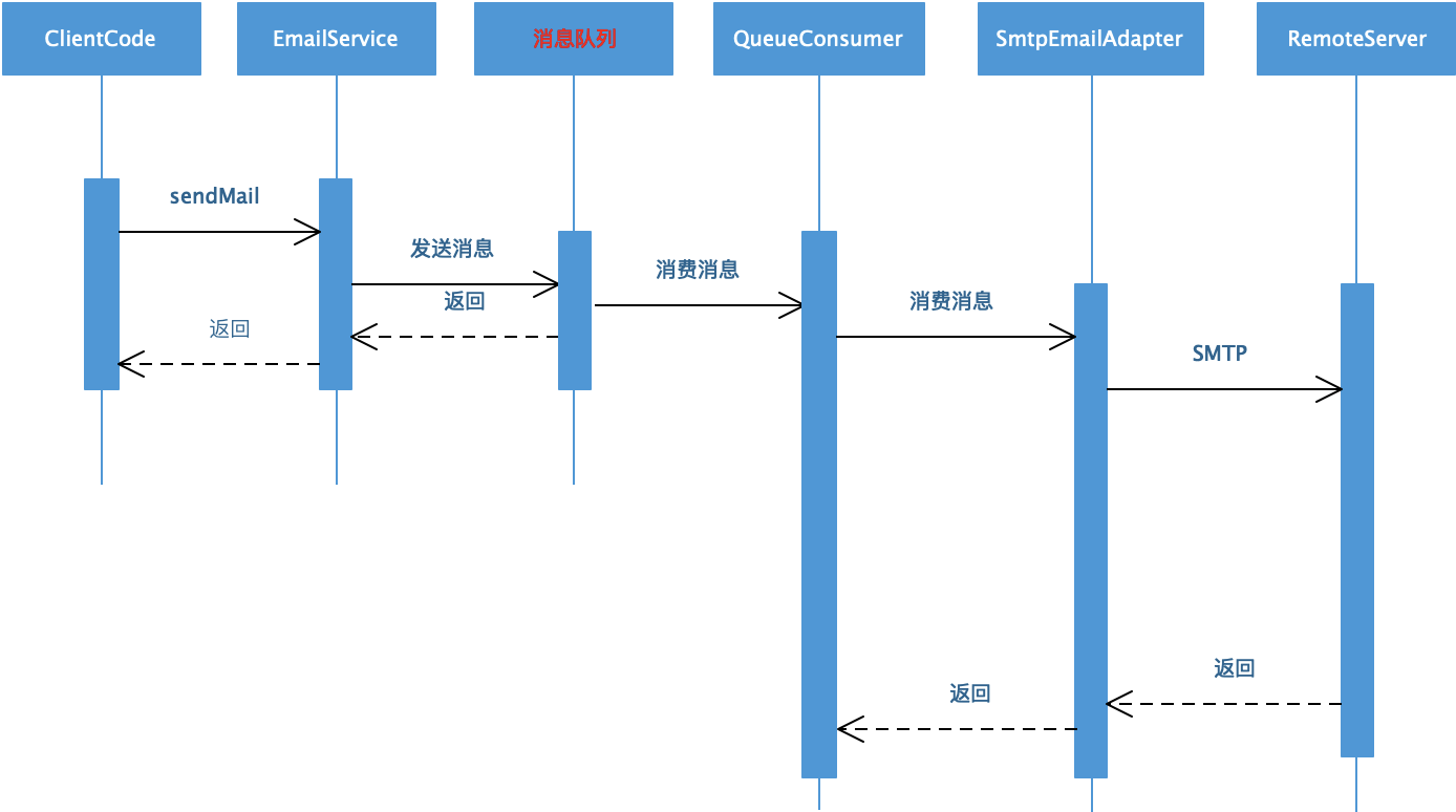 应用程序ClientCode调用EmailService的时候,EmailService将调用请求封装成一个邮件发送消息发送给消息队列,然后就直接返回了,应用程序收到返回以后就可以继续执行,快速完成用户响应,释放系统资源。
