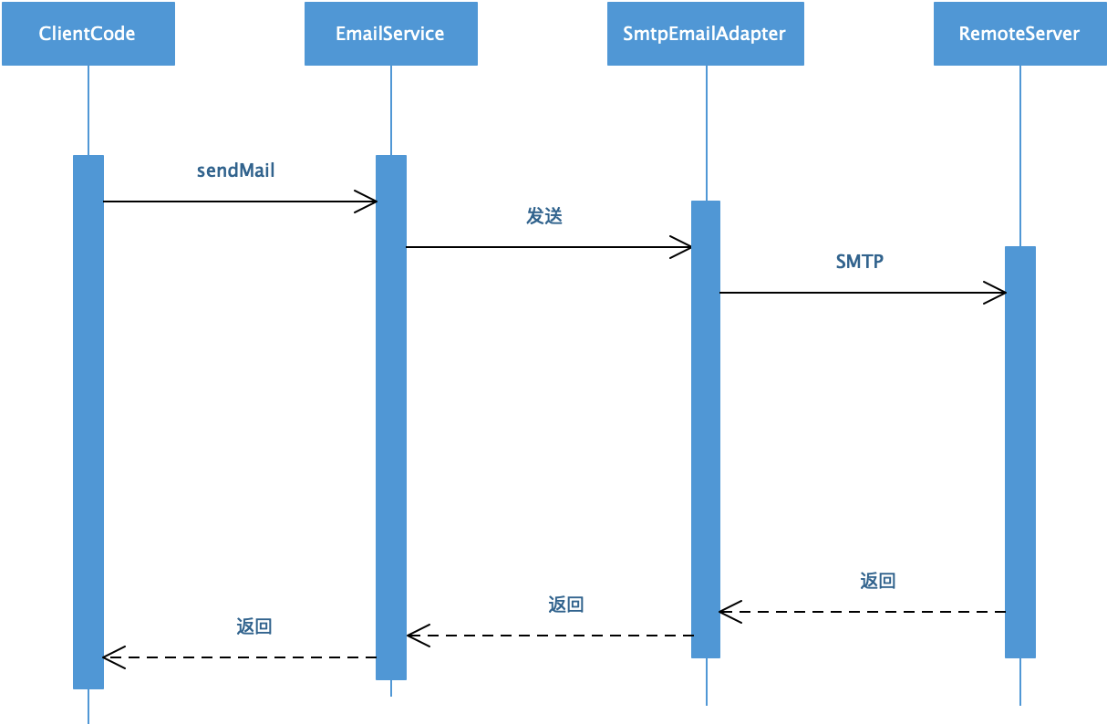 应用程序代码ClintCode需要发送邮件,调用接口服务EmailService,实现了EmailService接口的SmtpEmailAdapter通过SMTP协议与远程服务器通信,远程邮件服务器可能有很多邮件在等待发送,当前邮件可能要等待较长时间才能发送成功,发送成功后再通过远程通信返回结果给应用程序。