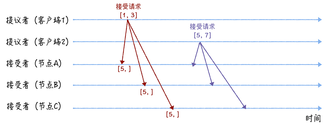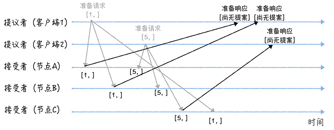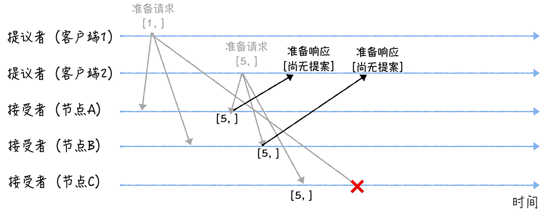 我们假设客户端1的提案编号为1,客户端2的提案编号为5,并假设节点A、B先收到来自客户端1的准备请求,节点C先收到来自客户端2的准备请求。