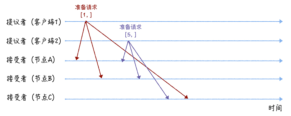 先来看第一个阶段,首先客户端1、2作为提议者,分别向所有接受者发送包含提案编号的准备请求: