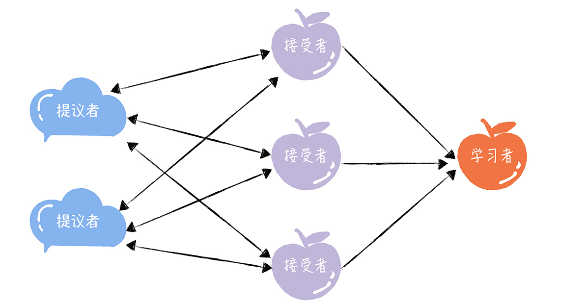在Basic Paxos中,有提议者(Proposer)、接受者(Acceptor)、学习者(Learner)三种角色,他们之间的关系如下: