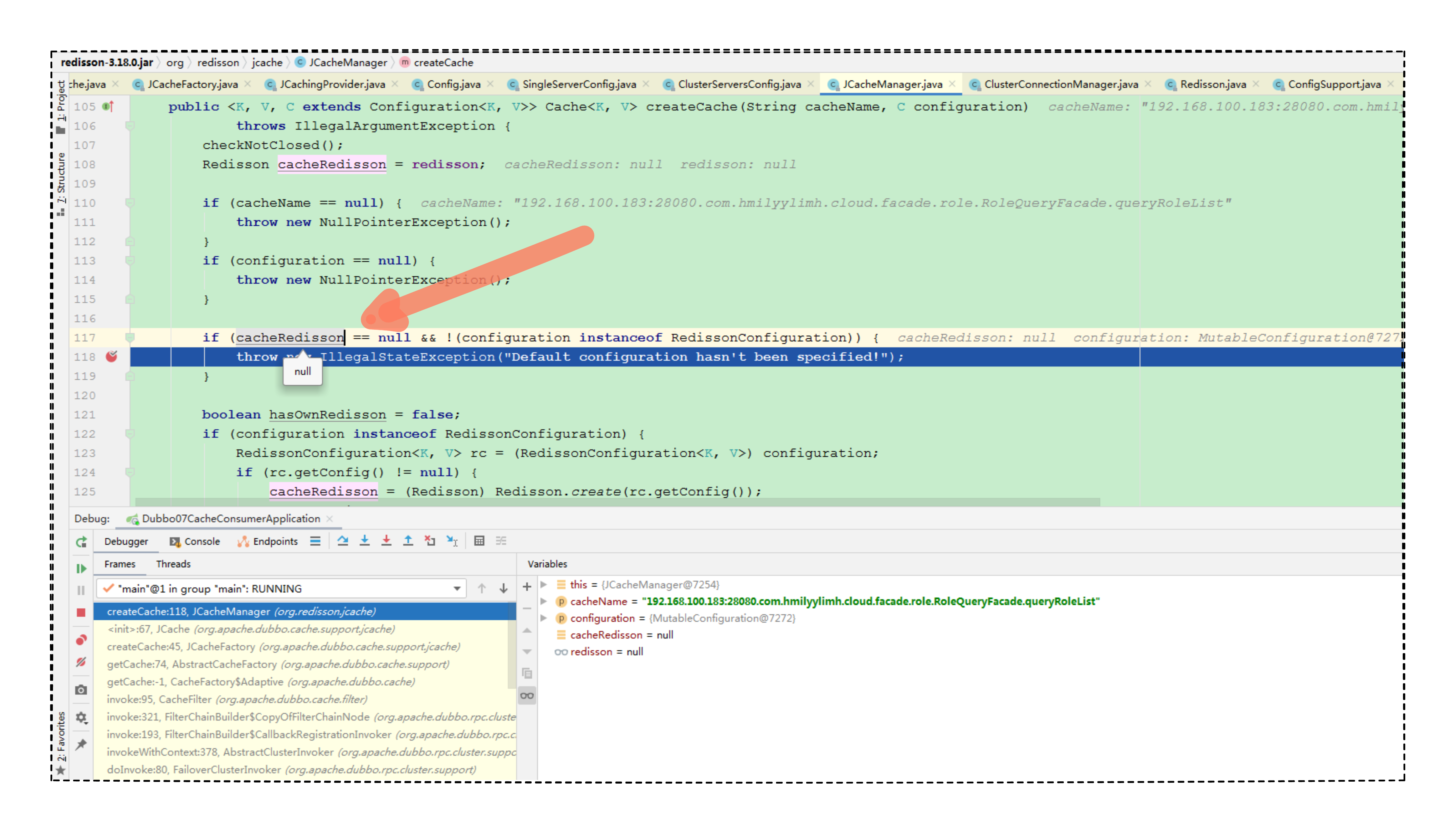 Caused by: java.lang.IllegalStateException: Default configuration hasn't been specified! at org.redisson.jcache.JCacheManager.createCache(JCacheManager.java:118) at org.apache.dubbo.cache.support.jcache.JCache.<init>(JCache.java:67) at org.apache.dubbo.cache.support.jcache.JCacheFactory.createCache(JCacheFactory.java:45) at org.apache.dubbo.cache.support.AbstractCacheFactory.getCache(AbstractCacheFactory.java:74) at org.apache.dubbo.cache.CacheFactory$Adaptive.getCache(CacheFactory$Adaptive.java) at org.apache.dubbo.cache.filter.CacheFilter.invoke(CacheFilter.java:95) at org.apache.dubbo.rpc.cluster.filter.FilterChainBuilder$CopyOfFilterChainNode.invoke(FilterChainBuilder.java:321) at org.apache.dubbo.rpc.cluster.filter.FilterChainBuilder$CallbackRegistrationInvoker.invoke(FilterChainBuilder.java:193) at org.apache.dubbo.rpc.cluster.support.AbstractClusterInvoker.invokeWithContext(AbstractClusterInvoker.java:378) at org.apache.dubbo.rpc.cluster.support.FailoverClusterInvoker.doInvoke(FailoverClusterInvoker.java:80) ... 25 more