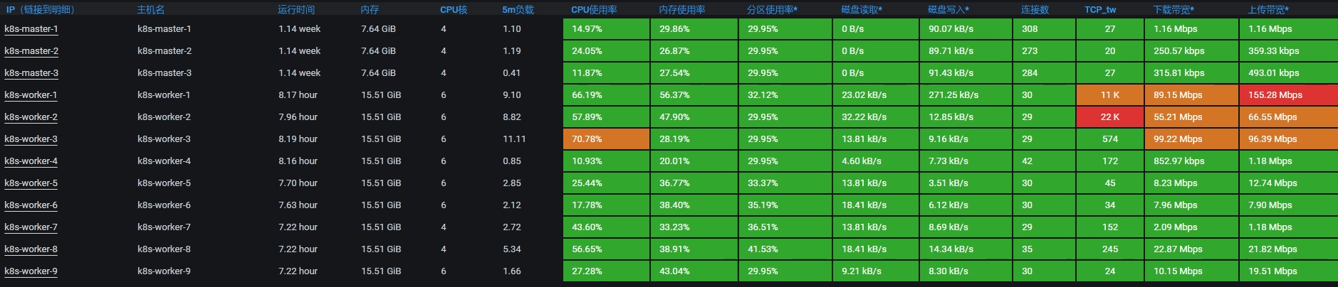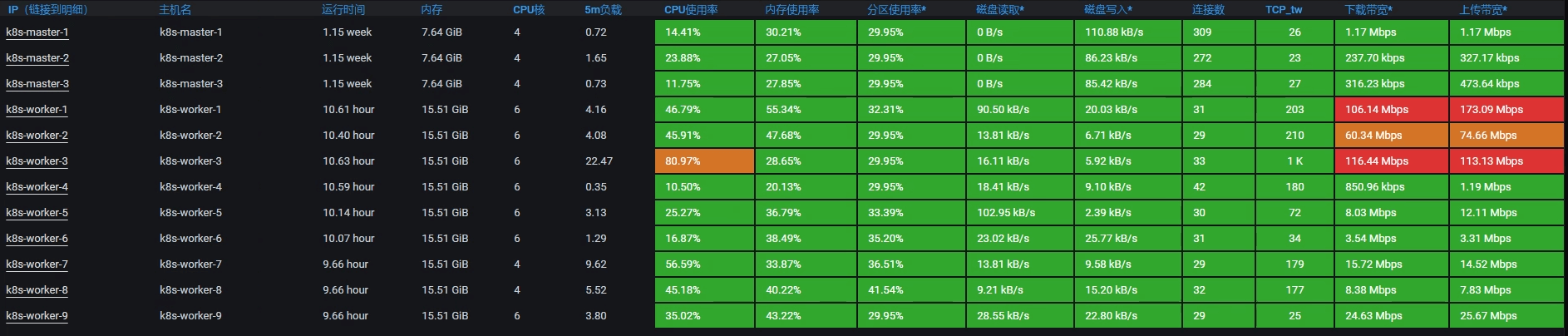 看起来不错哦,worker-8 的 CPU 使用率降到了 56.65%,同时worker-3 的 CPU 使用率升到了 70.78%。不过网络带宽有几个地方变红了,这个我们后面再分析。至少我们从这里看到,压力是起来了。