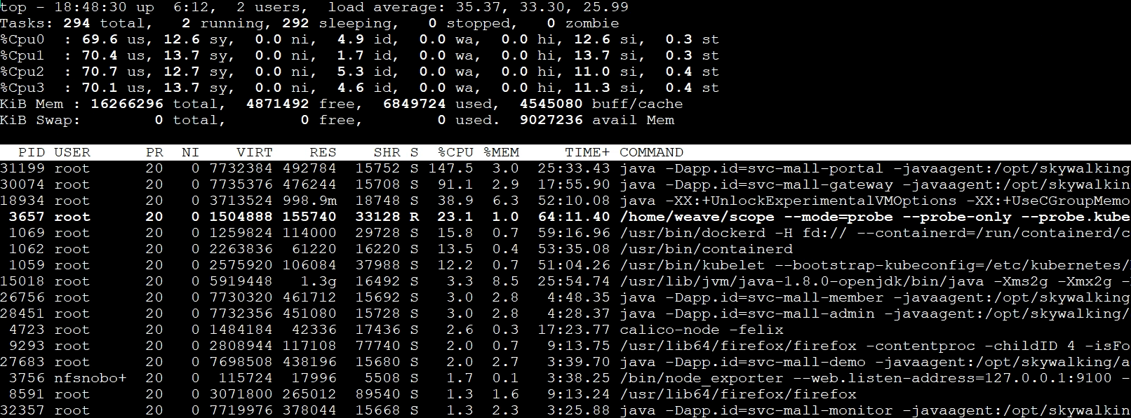 为了弄清楚那些与被测系统无关的应用,会对带宽消耗产生影响进而影响TPS,我们现在先把影响带宽的应用都删除了,比如Weave Scope、Monitoring的监控工具等,从列表中来看这些应用占了不小的带宽。