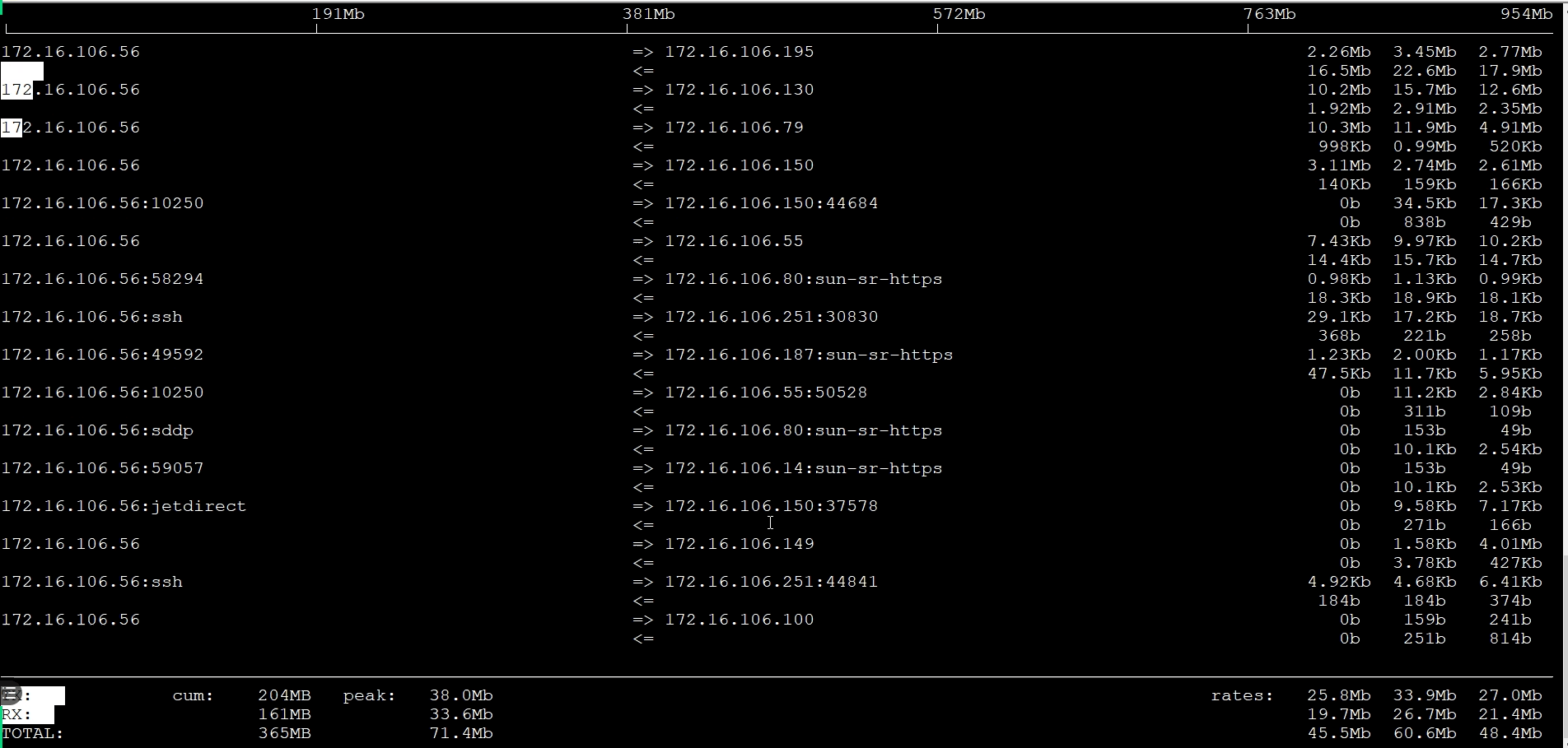 可以看到,IO都是NFS写过来的。那NFS的流量又是从哪里来的呢?从下面的数据来看,这些流量是从各个挂载了NFS盘的机器写过来的,这是我们一开始部署应用的时候,考虑统一使用NFS来做IO的思路。因为这个机器挂载了一个大容量的磁盘,为了保证磁盘够用,就把多个主机挂载了NFS盘。