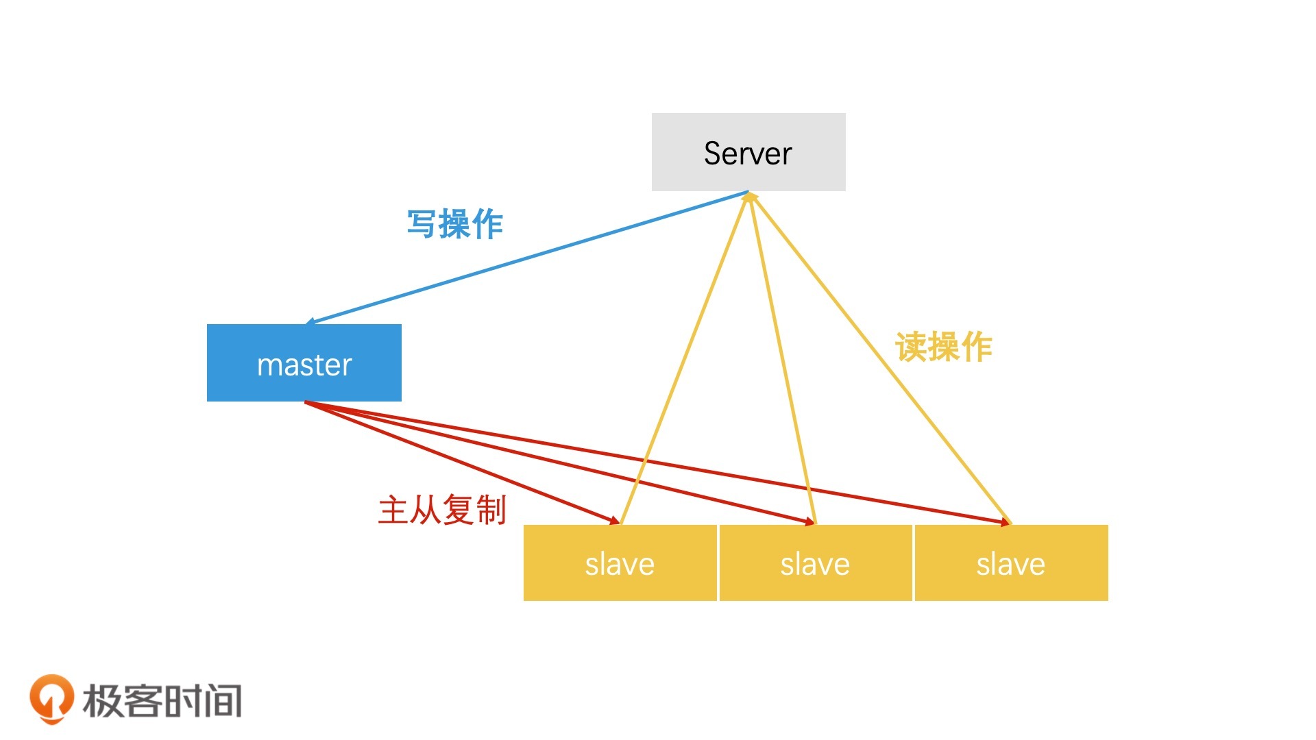 比如说,MySQL的Master - Slave架构。在MySQL的Master - Slave的架构设计中,master负责接收写请求。在数据写入master以后,master会和多个slave进行同步,将数据更新到所有的slave中。所有的slave仅负责处理读请求。这样,MySQL就可以完成读写分离了。