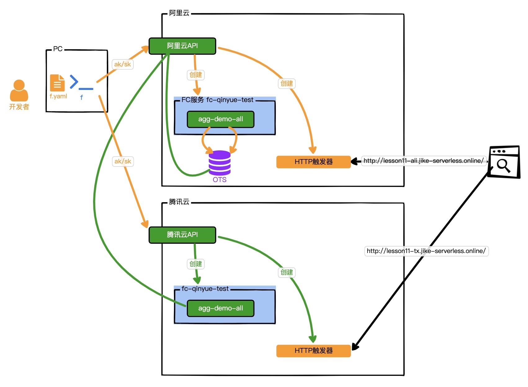 这里我需要提醒你一下,这2个云服务都是以阿里云的OTS服务作为数据库存储。这也是FaaS服务编排的强大之处,现在有些云服务商提供的BaaS服务是支持其他云服务商通过ak/sk访问的。另外如下图所示,如果我们采用ak/sk编排云服务商的HTTP API服务,那么利用FaaS就可以实现混合云编排服务了。
