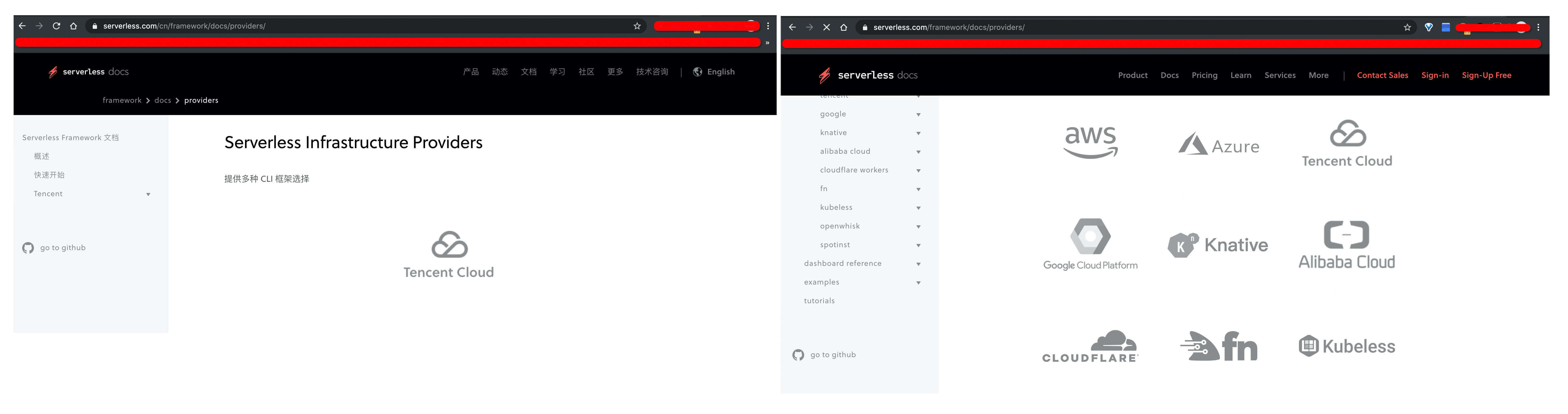 另外Serverless Framework也支持将应用部署到其他Provider:AWS、阿里云、Azure,还有Knative等等,正如以下图示。不过这里有个小问题:就是我们只有在英文版Serverless框架的官网上才能看到其他云服务商的Provider和文档介绍(中文版Serverless框架官网一并给出)。