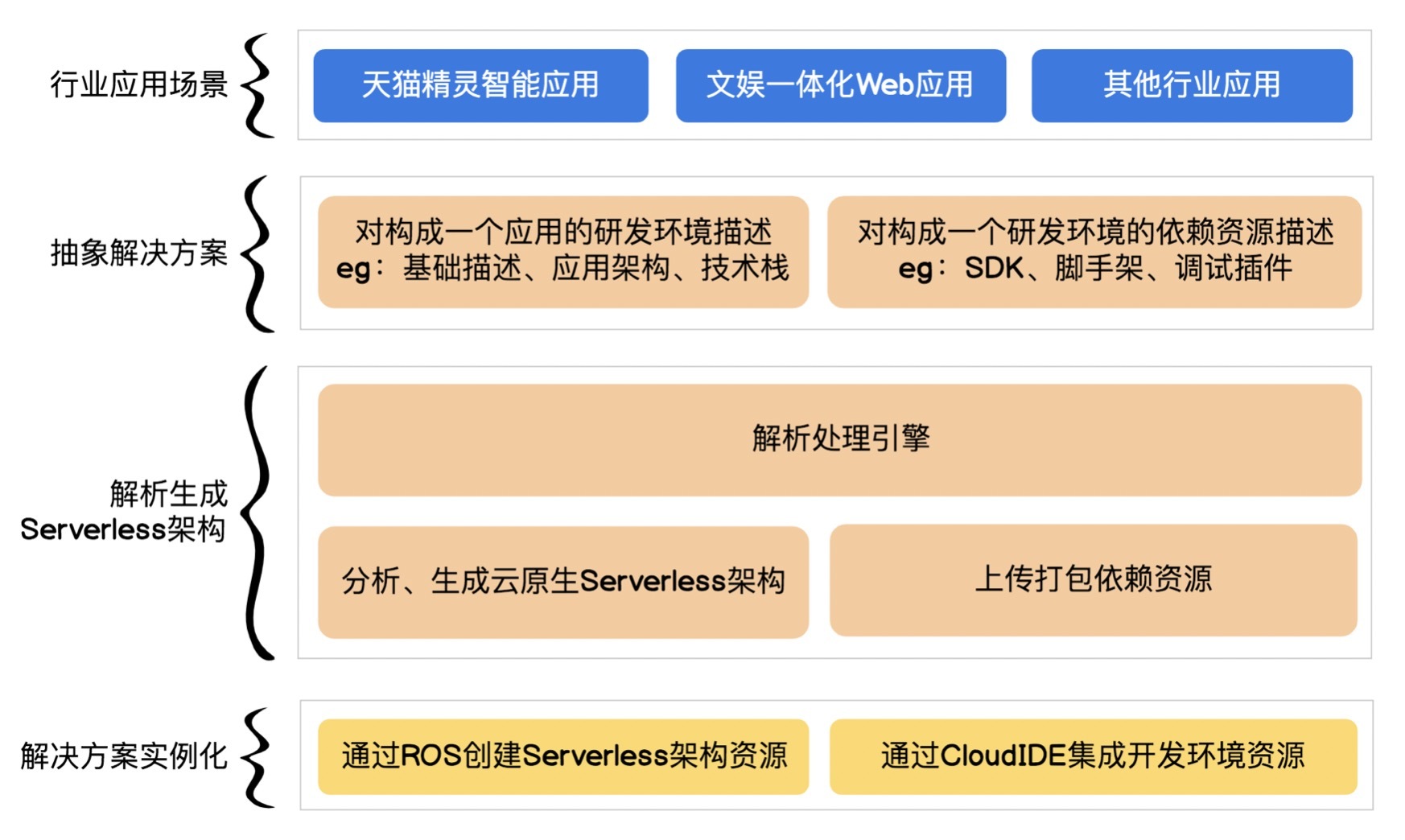 正如下图所示,云开发平台是将大厂的行业应用场景沉淀成了解决方案,解析生成Serverless架构,这样我们就可以把云开发平台上实例化的“解决方案”快速应用到我们的Serverless应用中来。基于成熟Serverless的应用,“反序列化”快速沉淀为解决方案,这也是云服务平台会收录Midway FaaS和Malagu的原因。