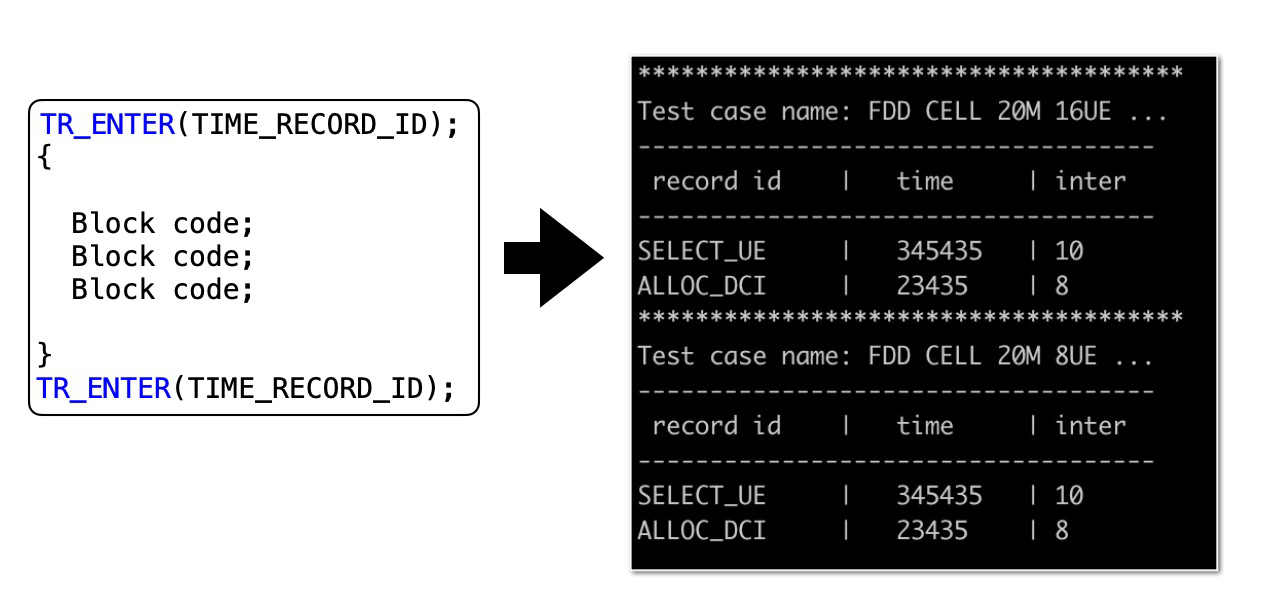 在图中,左边是添加打点代码的示例,其中大括号中的代码会按照TIME_RECORD_ID,来统计执行花费的CPU的Cycle数目(指令周期);右边则是根据性能测试场景,打印出的各个业务流程的具体执行开销。