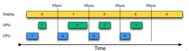 为解决这个问题,Project Buffer引入了VSYNC,它类似于时钟中断。每收到VSYNC中断,CPU会立即准备Buffer数据,由于大部分显示设备刷新频率都是60Hz(一秒刷新60次),也就是说一帧数据的准备工作都要在16ms内完成。