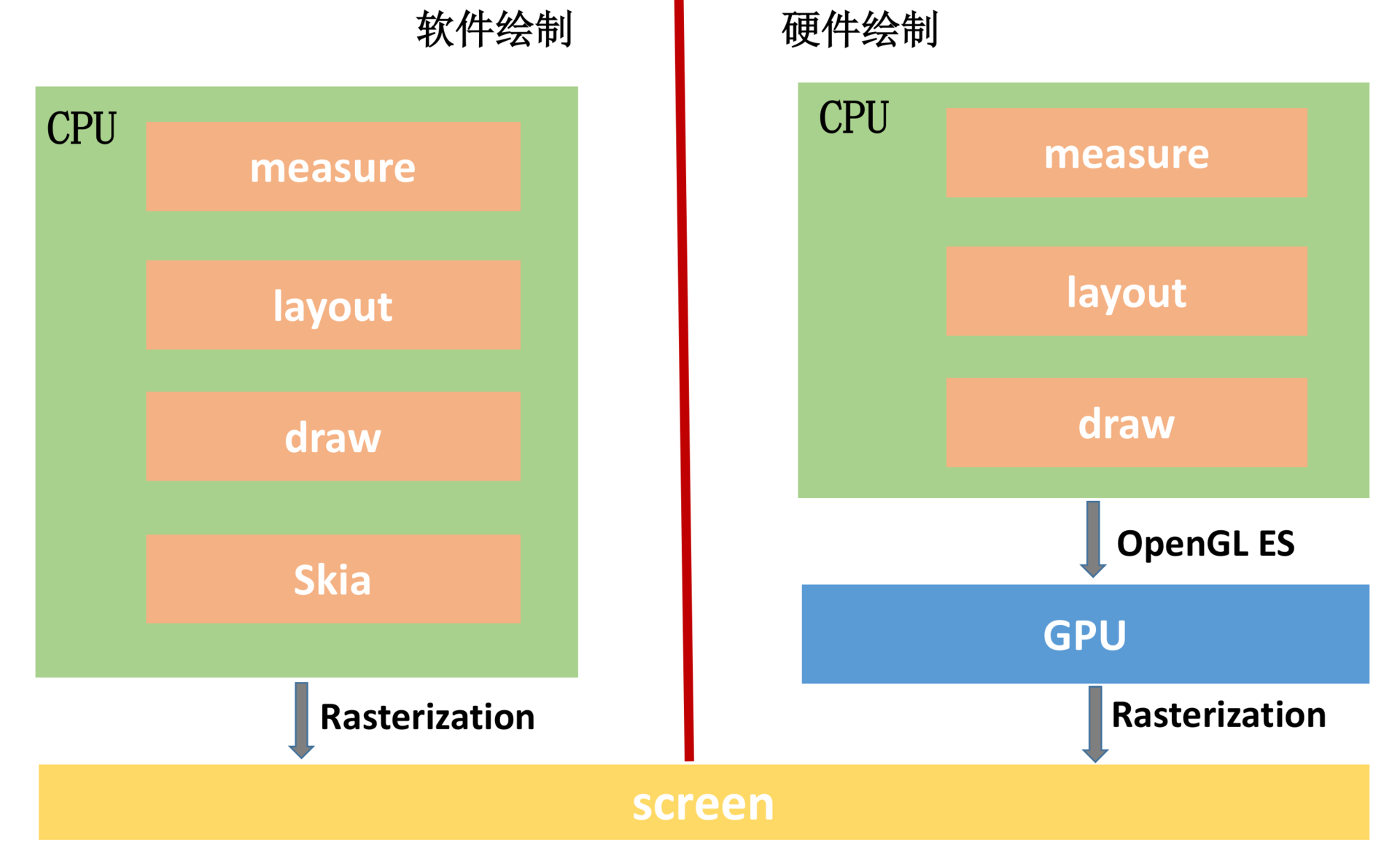 你可以从图上看到,软件绘制使用的是Skia库,它是一款能在低端设备如手机上呈现高质量的2D跨平台图形框架,类似Chrome、Flutter内部使用的都是Skia库。