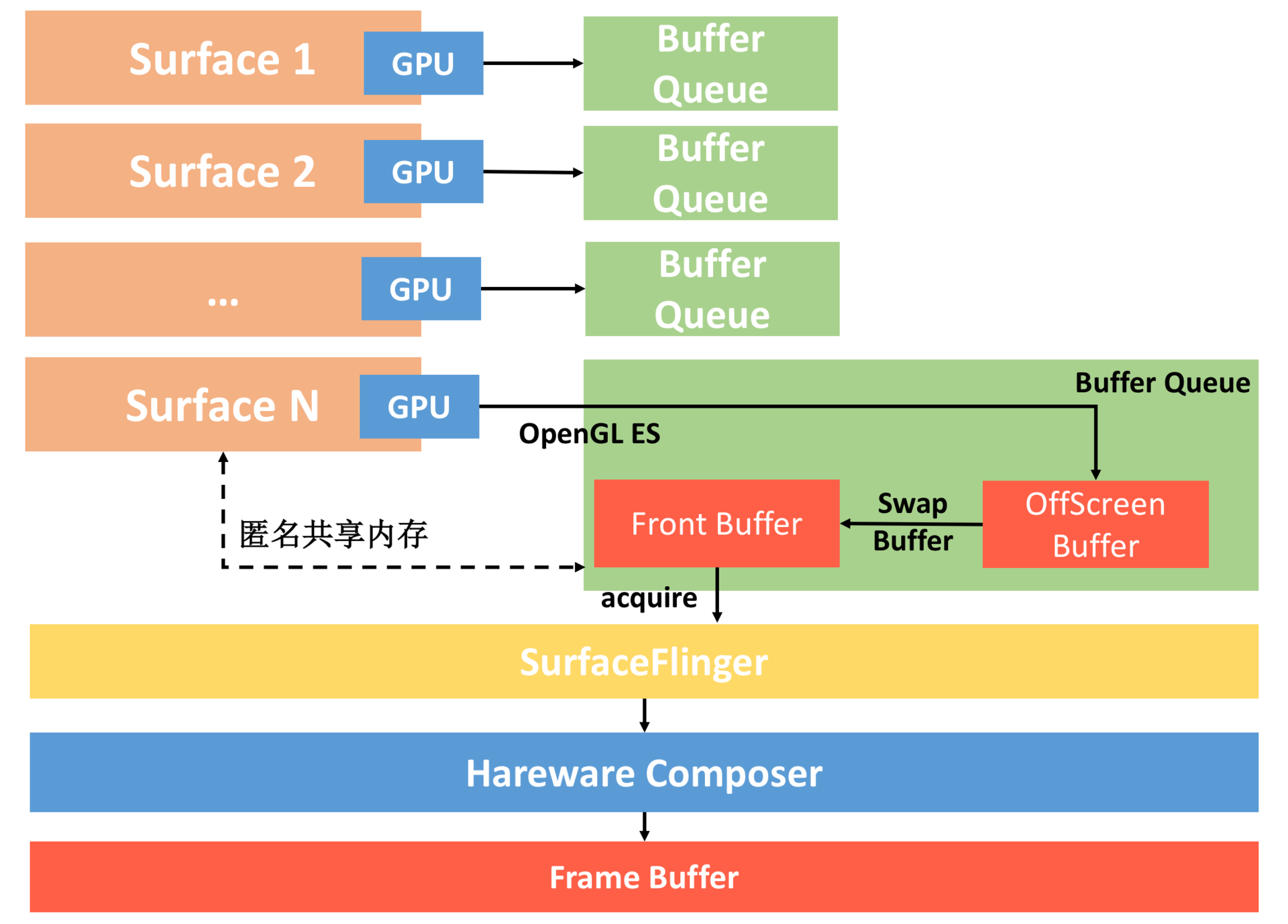 - 每个Surface对应的BufferQueue内部都有两个Graphic Buffer ,一个用于绘制一个用于显示。我们会把内容先绘制到离屏缓冲区(OffScreen Buffer),在需要显示时,才把离屏缓冲区的内容通过Swap Buffer复制到Front Graphic Buffer中。