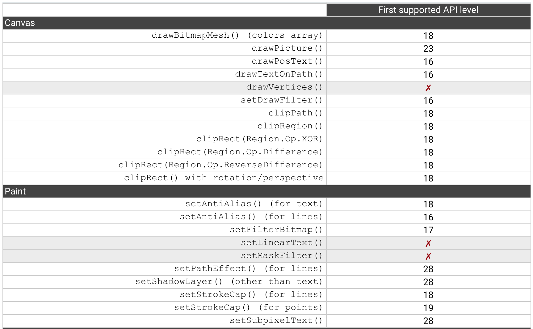 在官方硬件加速的文档中,可以看到很多API都有相应的Android API level限制。