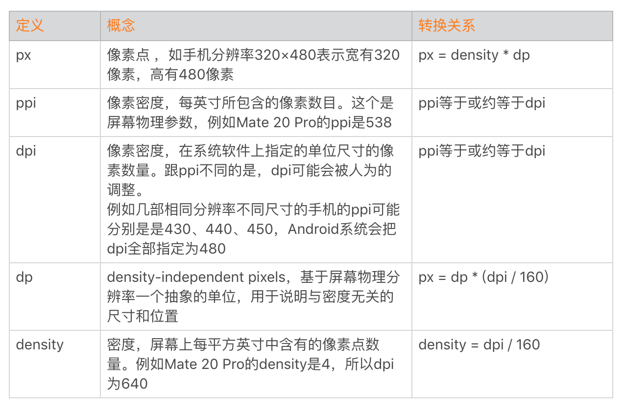对于屏幕碎片化的问题,Android推荐使用dp作为尺寸单位来适配UI,因此每个Android开发都应该很清楚px、dp、dpi、ppi、density这些概念。